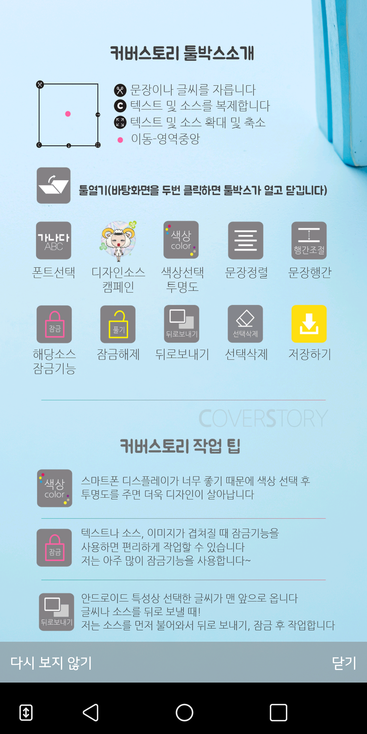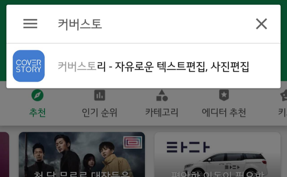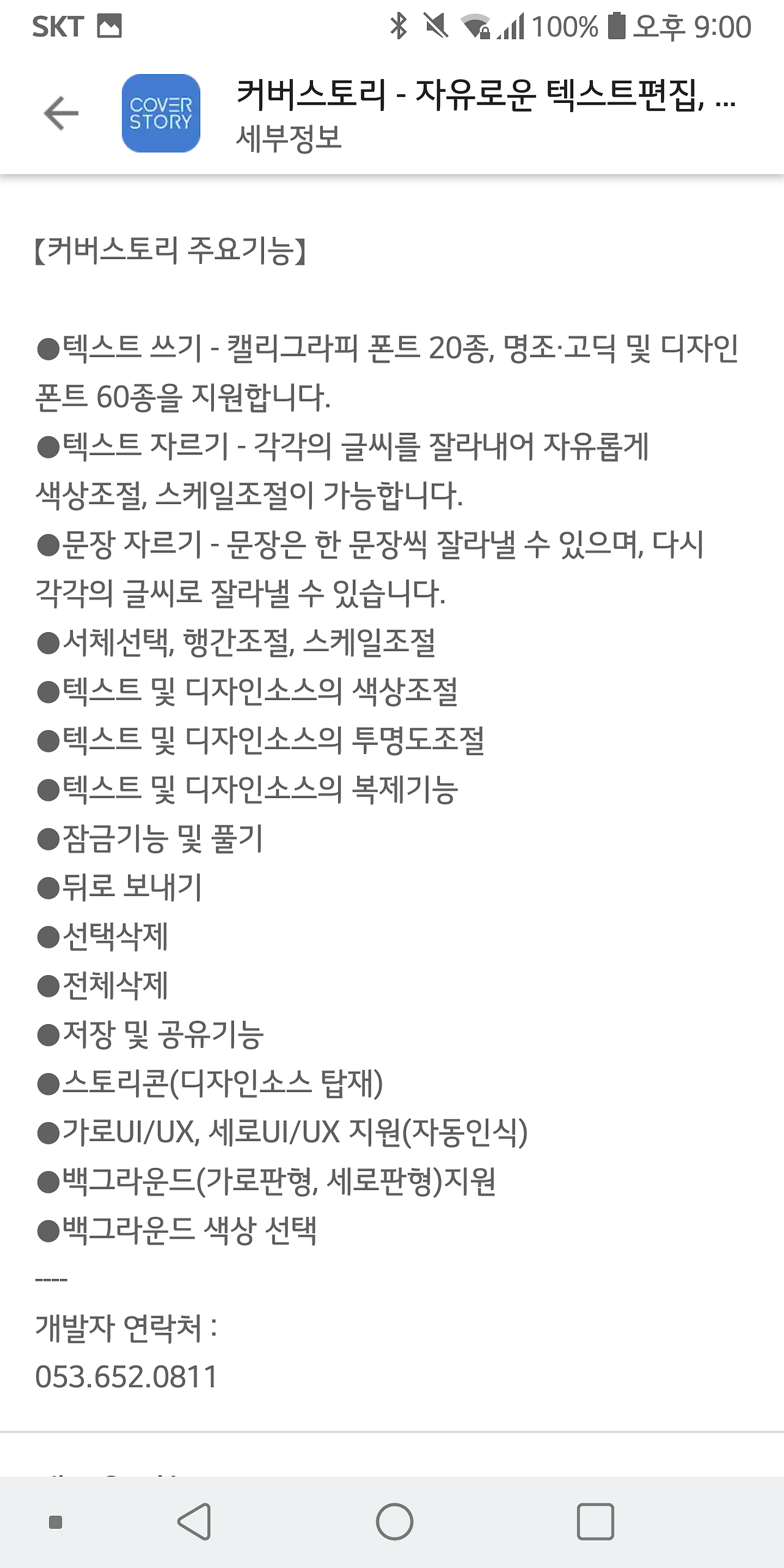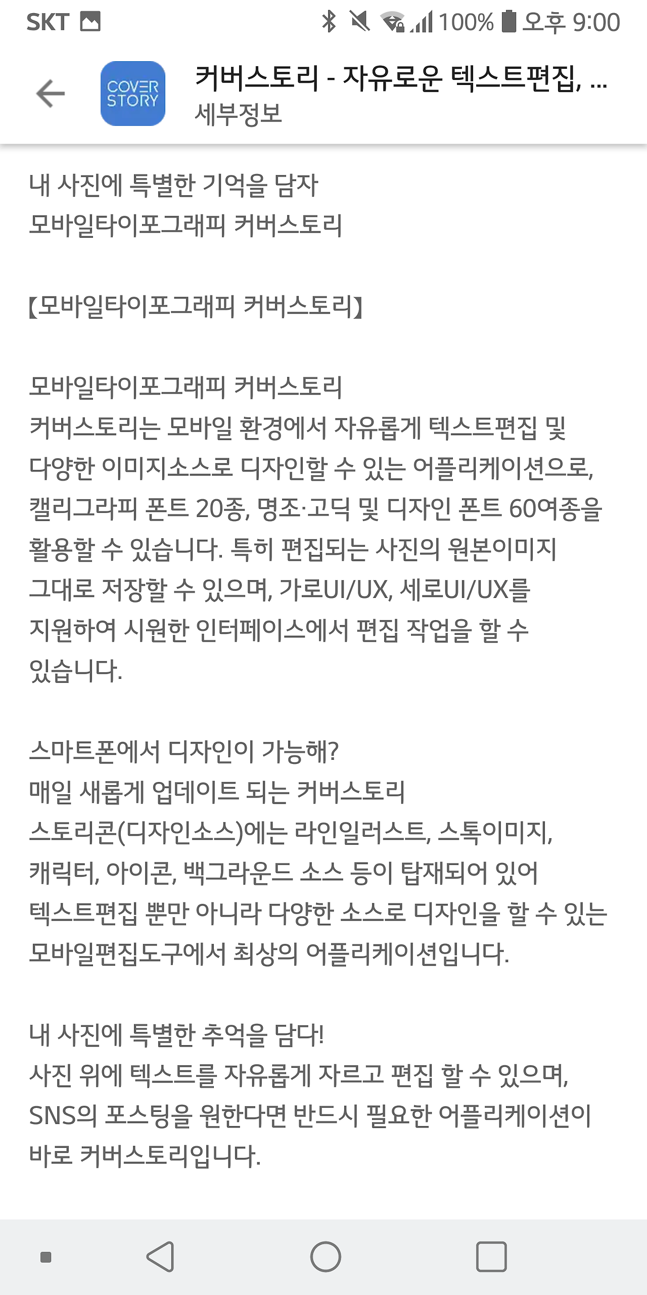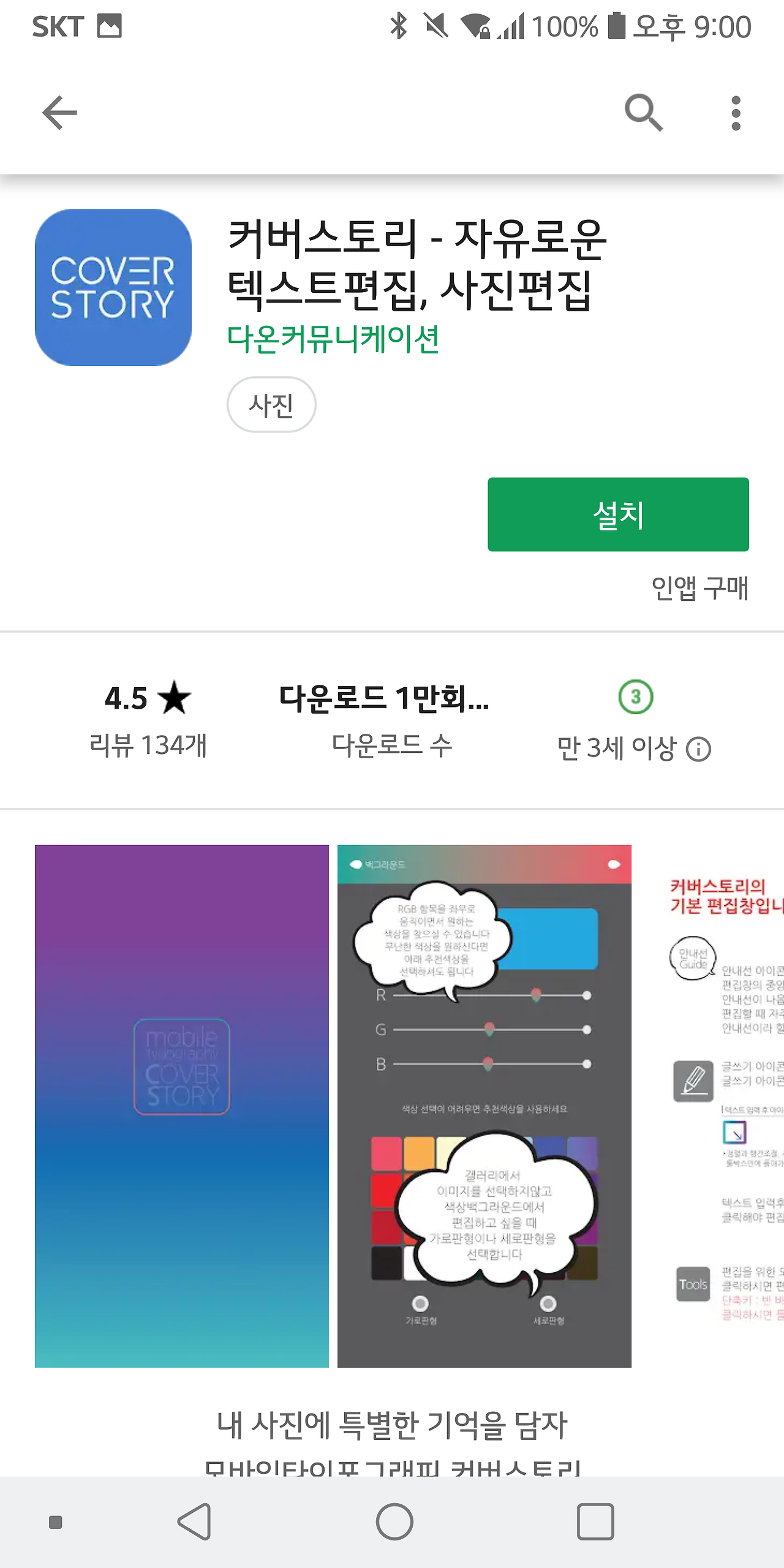 우선 안드로이드 플레이스토어에서 '커버스토리'를 검색하시면 앱을 무료로 다운로드할 수 있습니다. 앱의 설명과 주요 기능들은 따로 설명할 필요가 없을 정도로 너무 자세하게 설명되어 있으니 넘어갈게요~