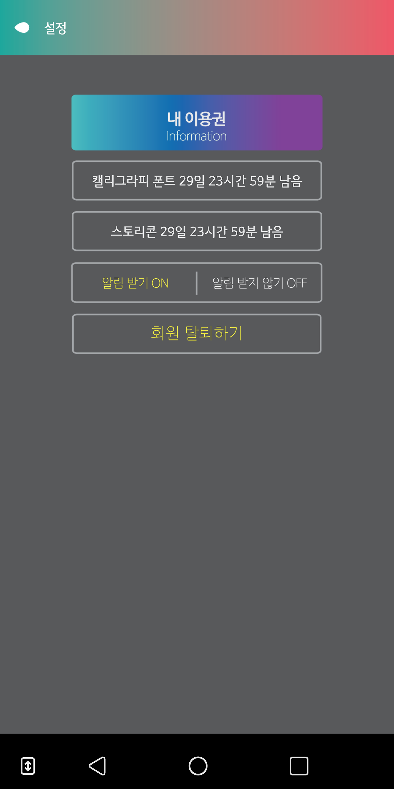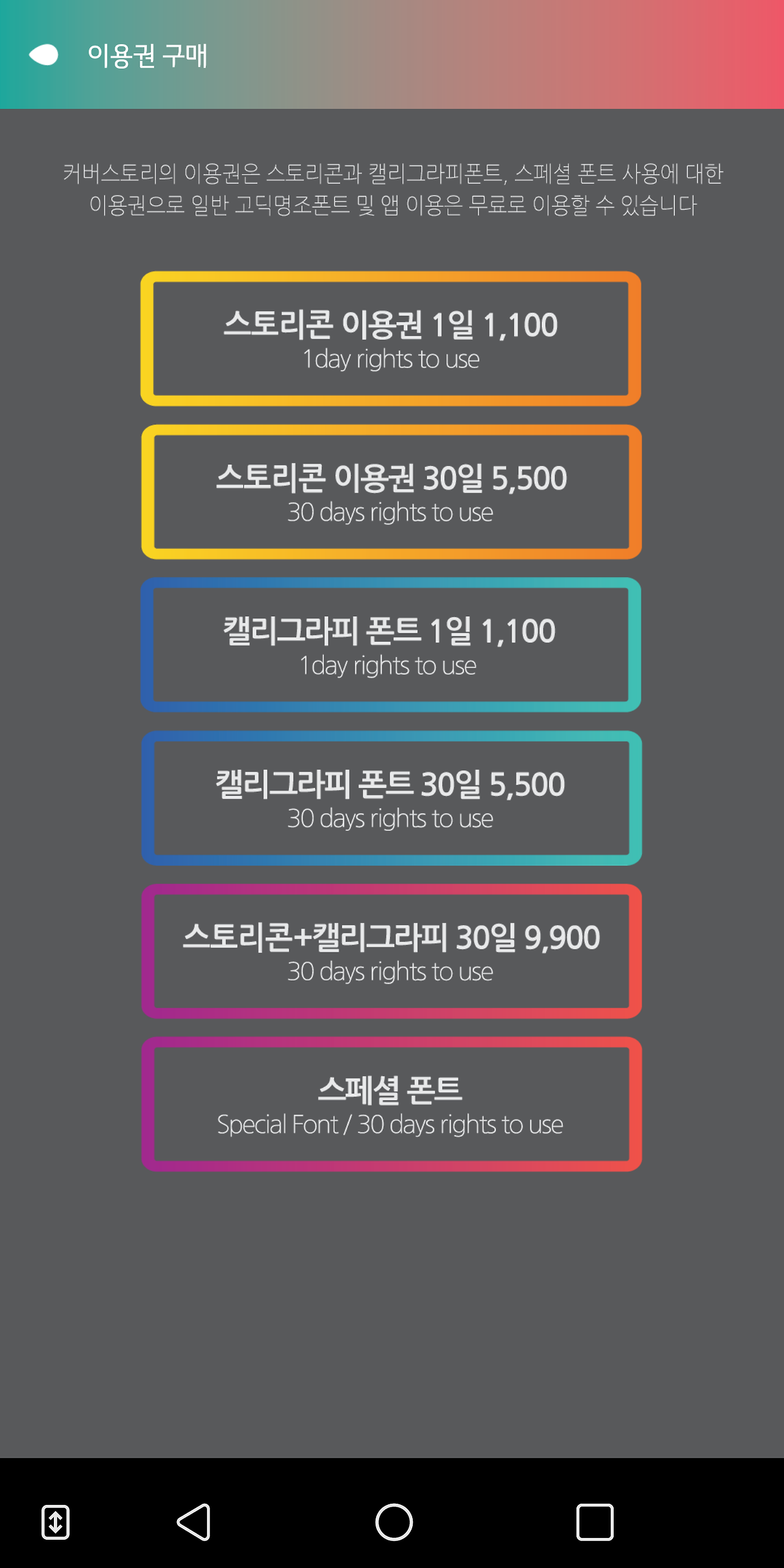 다양한 이용권을 판매하고 있었습니다. 사용용도에 따라 다양한 인앱 구매 옵션을 둔 건 괜찮은 것 같네요! 유료라서 어떻게 테스트를 해볼까 걱정했는데~ 웬일! 앱을 다운로드하면 한 달 동안은 충분히 무료로 써볼 수 있도록 '스토리콘+캘리그래피 30일 9,900원' 서비스를 제공합니다.
