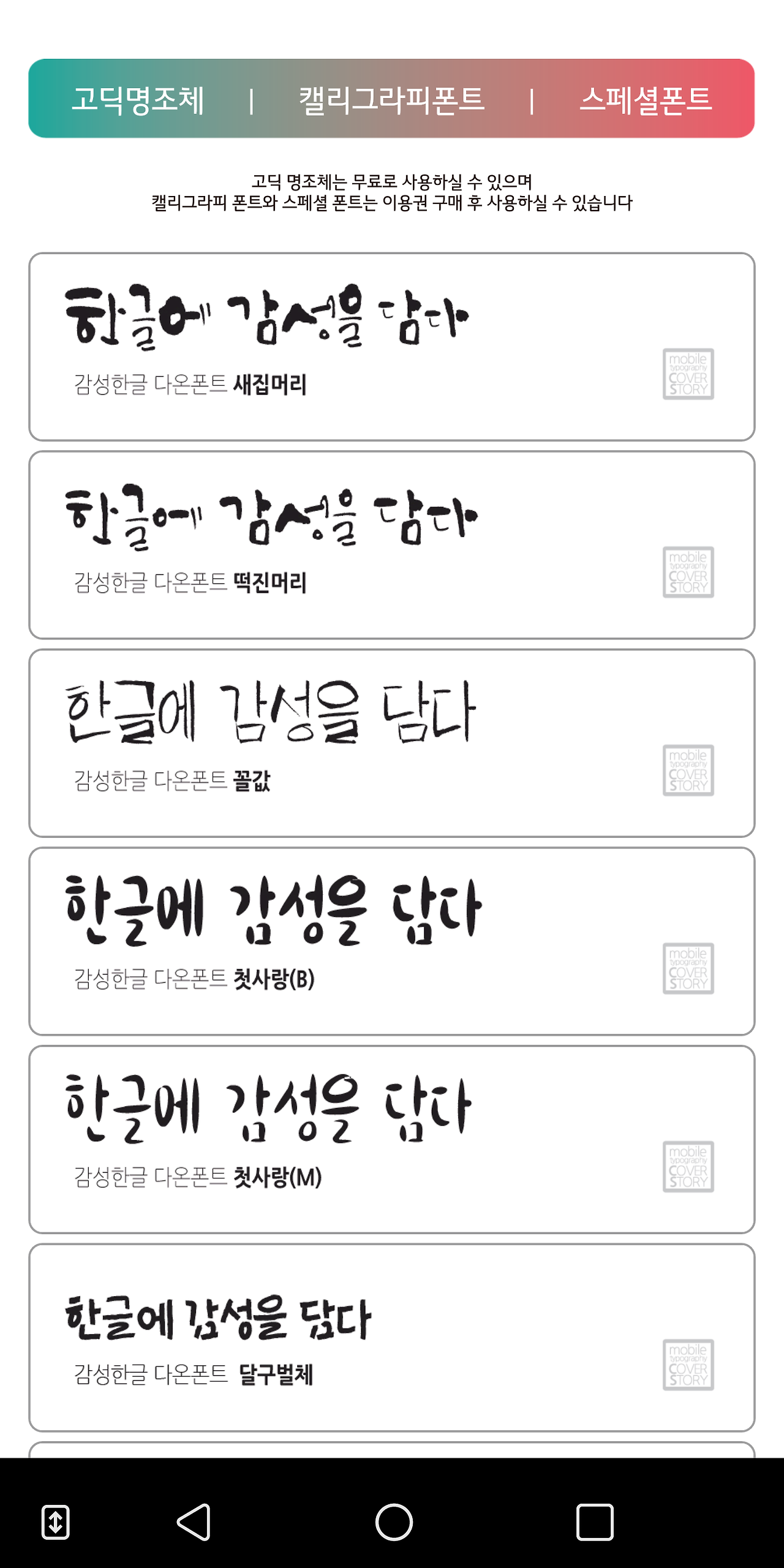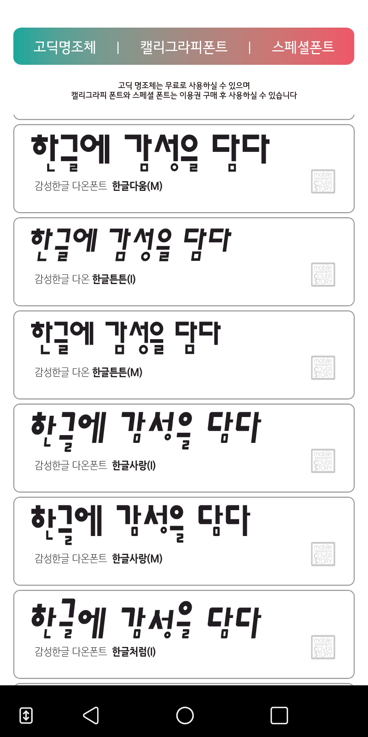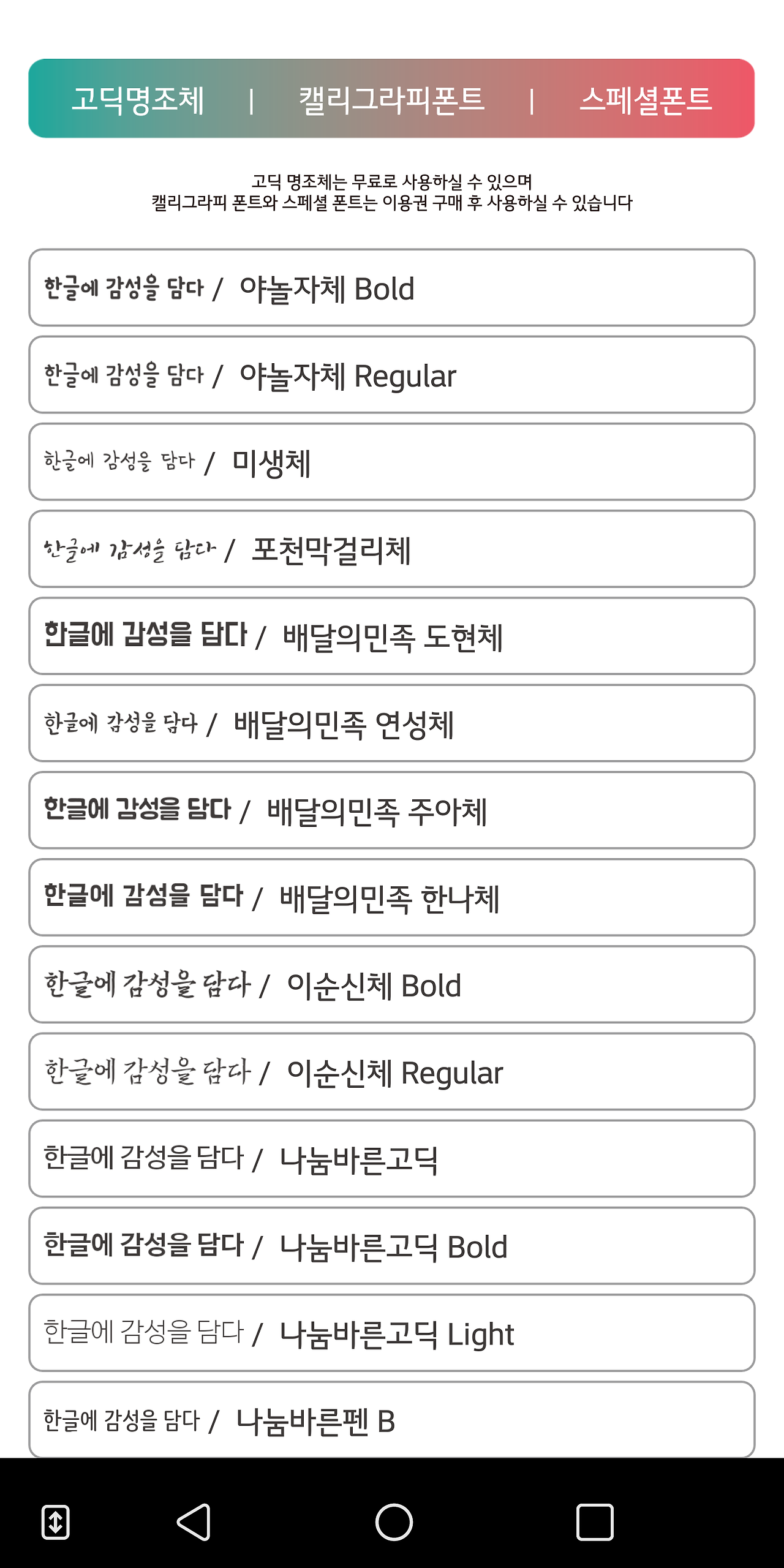 툴박스를 클릭하고 폰트를 누르면~~ 무료로 사용할 수 있는 고딕명조체, 캘리그래피 폰트, 스페셜 폰트 등 엄청나게 다양한 폰트를 느낌에 따라 사용할 수 있습니다. 영어 폰트로 꾸밀 수 있는 앱은 많은데 다양한 한글 폰트를 원하는 대로 디자인할 수 있는 스마트폰 앱은 거의 없었던 게 사실입니다.