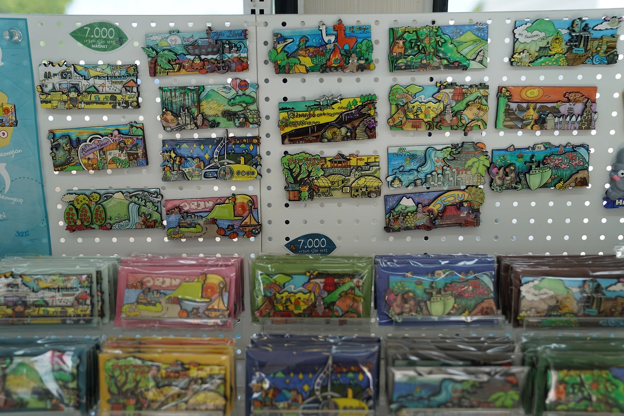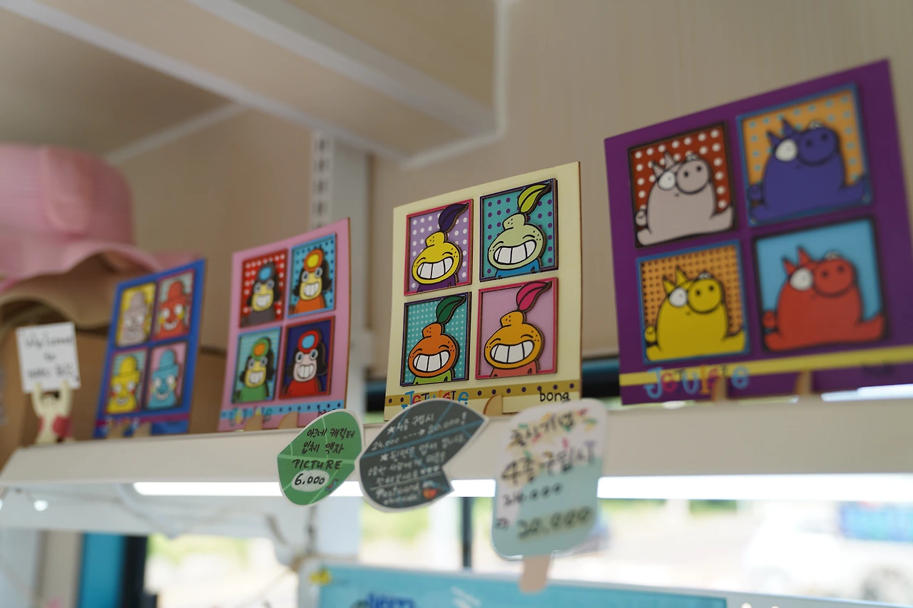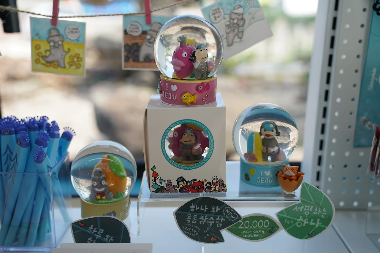 때로는 신기하고, 때로는 독특하고, 때로는 엉뚱하기도 한 아그네의 작품들과 그 안에 담기 스토리! 제주를 대표하는 17곳의 자연풍경이 담긴 마그넷, 제주 캐릭터가 담긴 스노우볼 등 여행지의 추억을 간직하고 담아갈 수 있는 기념품부터 다양한 캐릭터 상품들을 판매하고 있습니다. 단순한 기념품이 아닌 그 속에 담긴 이야기 하나하나 확인하는 재미도 있답니다.
