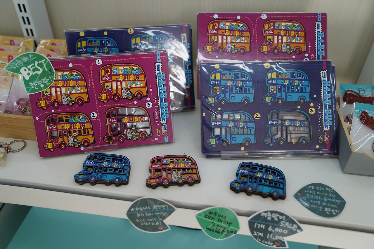 계산대 마저 하루버스를 닮은 2층 버스! 너무나 예쁘고 특이한 모습에 미소가 지어집니다. 하루버스가 특별한 이유는 바로 다른 곳에선 볼 수 없는 하루버스만의 기념품이 있기 때문입니다. 대부분의 기념품샵이 다양한 제주작가들의 작품, 제주를 담아낸 디자인 등으로 만들어진 제품들을 모아놓은 편집샵이라면 하루버스는 독특한 시선으로 담아낸 작가의 작품이 주를 이루고 있습니다.