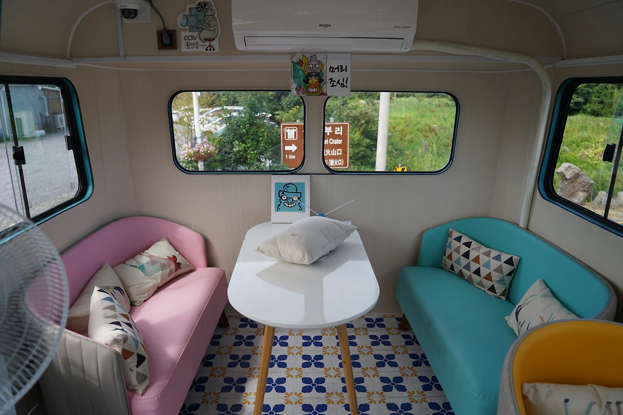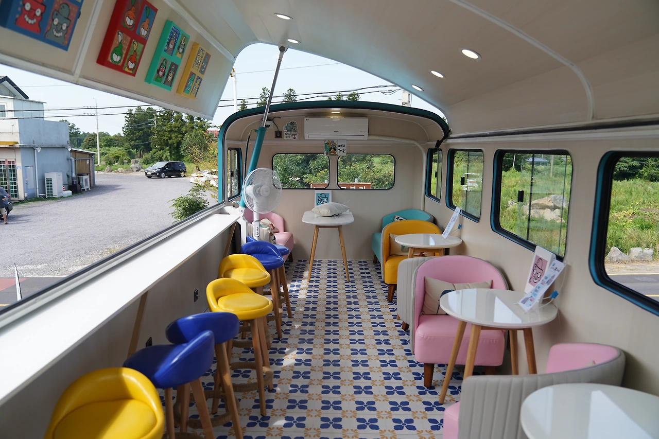 실내를 둘러보기 전에 우선 버스 주위를 한 바퀴 돌아봤습니다. 버스를 둘러 곳곳마다 그려진 그림들, 그 그림들은 제주 풍경을 보여주는 또 하나의 작품이었습니다. 제주바다, 한라산, 제주마, 성산일출봉 등 자세히 보면 제주 곳곳의 아름다운 풍경들을 담아내고 있었습니다.