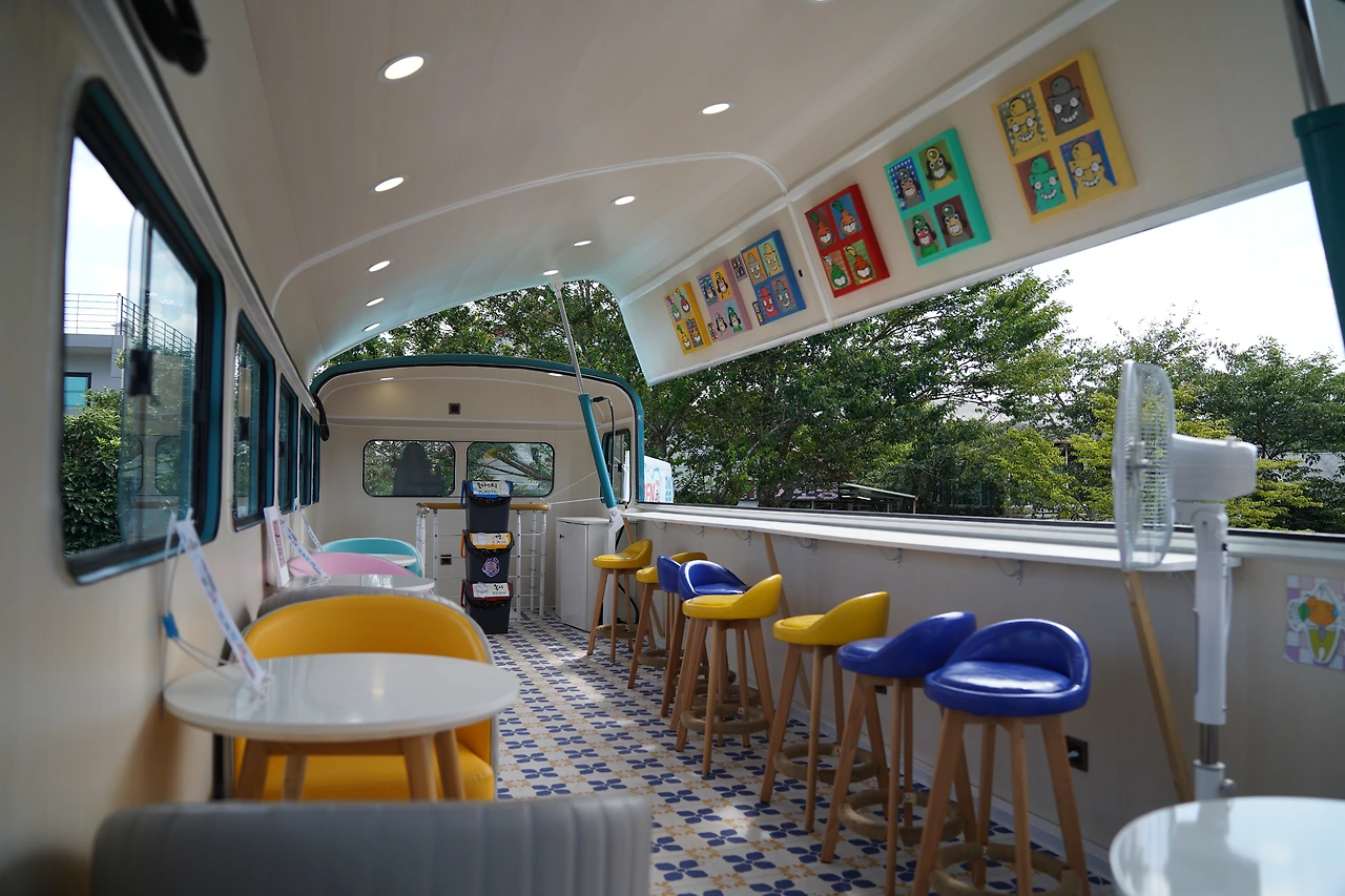 알록달록 바닥, 노랑파랑 의자, 하늘핑크 소파! 형형색색의 소품들이 루프탑의 풍경을 더욱 포근하고 머물고 싶게 만들어 주는 것 같습니다. 2층 루프탑이 그렇게 높은 편은 아니지만 2층에 올라 바라보는 풍경은 무척이나 색다릅니다. 루프탑이 열려 있어 푸르른 하늘을 바라볼 수 있기 때문일지도 모르겠습니다. 교래리에 가면 꼭 하루버스 루프탑에 올라보세요!