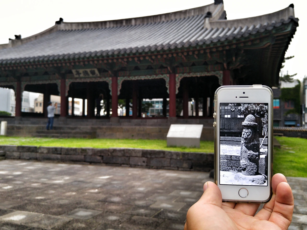 돌하르방 손의 위치를 보니 오른쪽 돌하르방은 맞아요. 그리고 일제시대에는 관덕정에 문을 달았었답니다. 사진을 보니 일제시대의 사진같아요. 그리고 지금까지 열 두번의 보수공사가 있었어서 사진의 모습과는 다른거랍니다!사진의 위치는 저기가 맞아요!