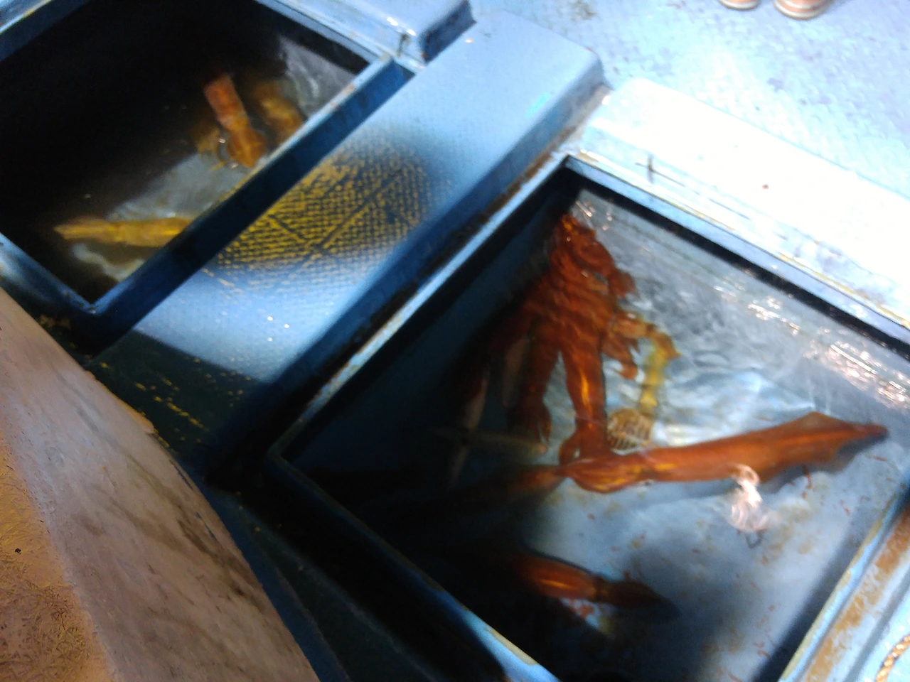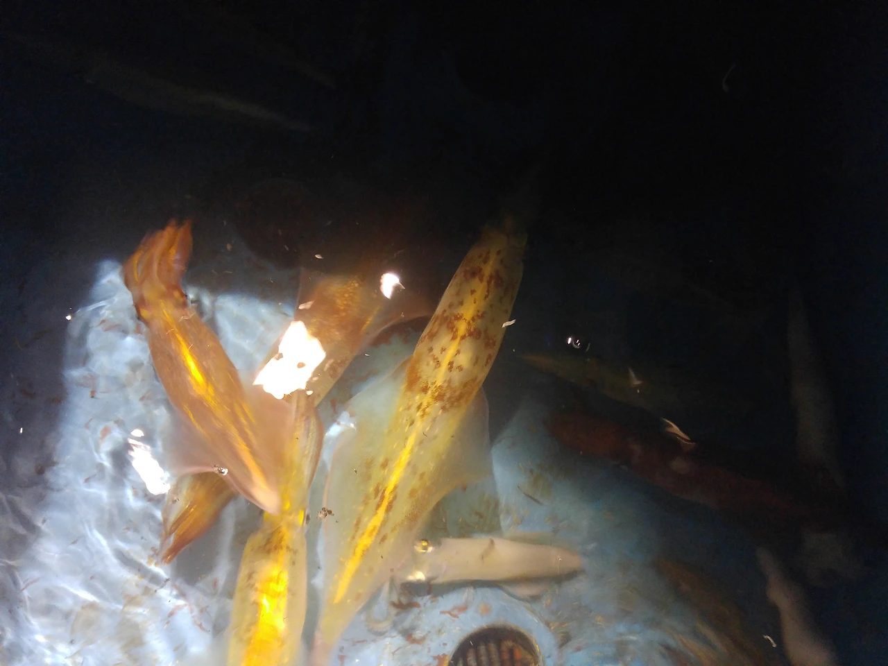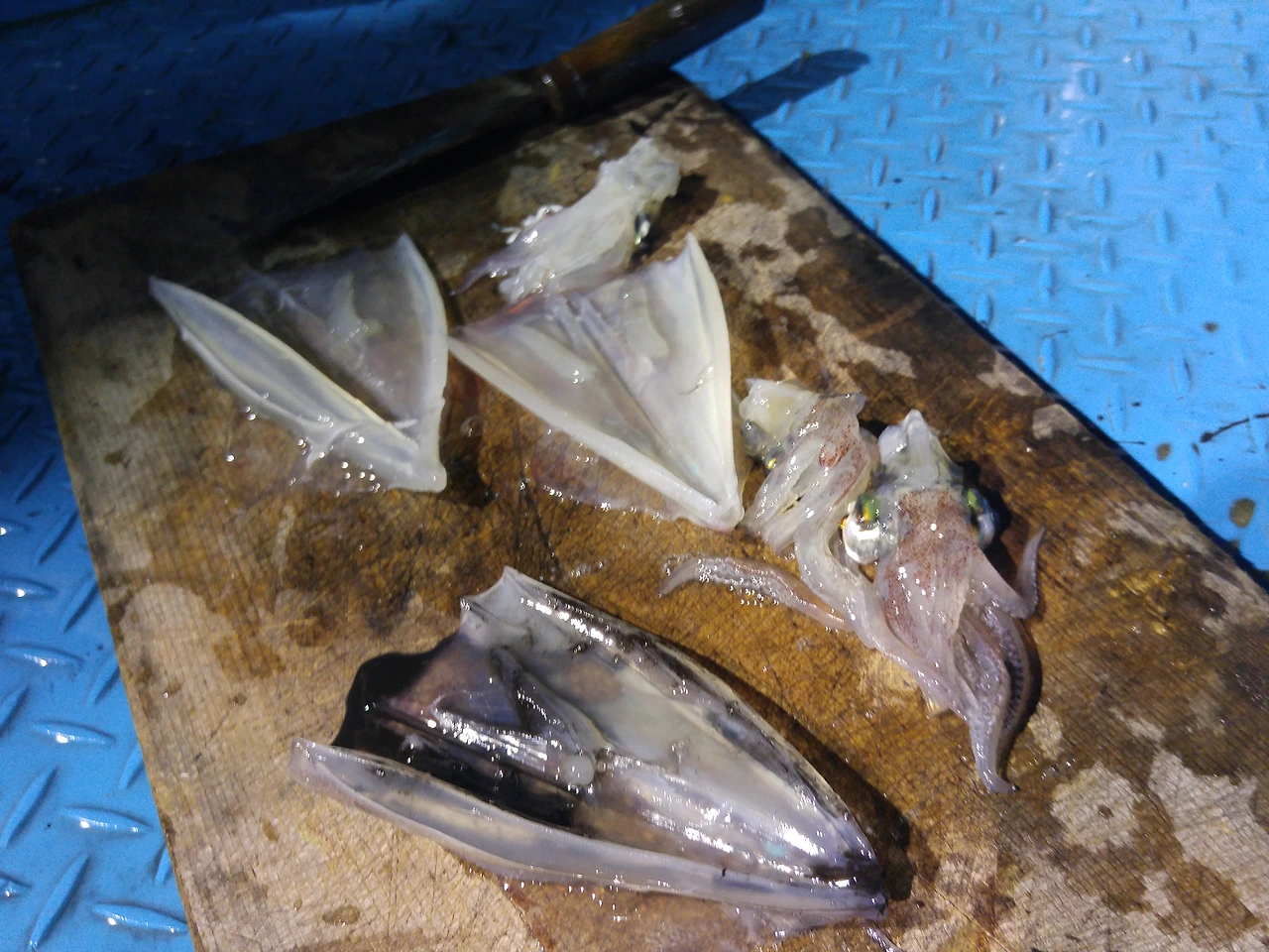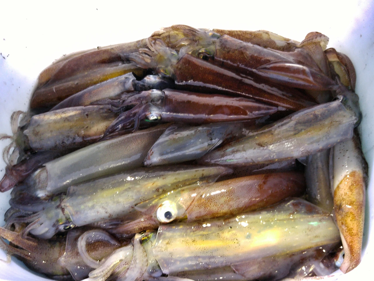바로 이만큼!! 처음에 아무것도 없던 빈 통에 이렇게 많은 한치로 가득 찼습니다. 낚시를 마치고 항으로 돌아온 후 휘파람을 불며 스쿠터를 타고 다시 제주시로 돌아왔습니다. 돌아온 후에도 욕실에 쭈그리고 앉아 일부는 바로 냉동실에 얼리고, 나머지는 열심히 손질하고 냉장실에 넣어두었답니다!