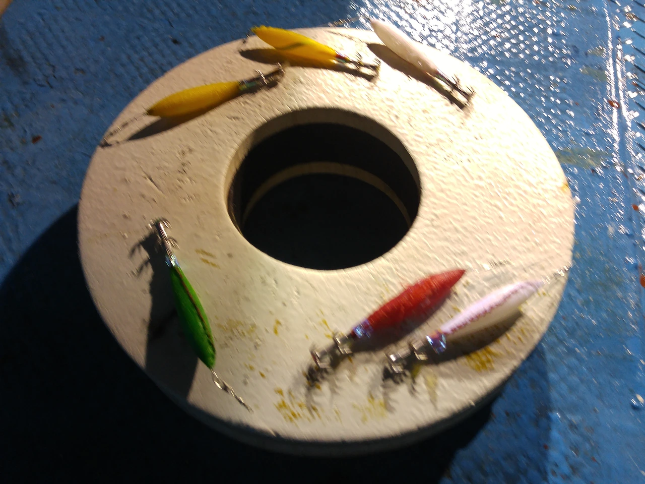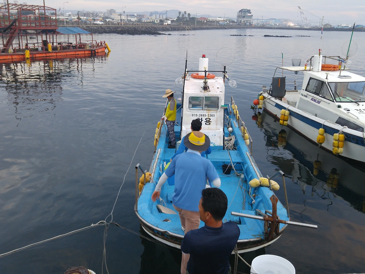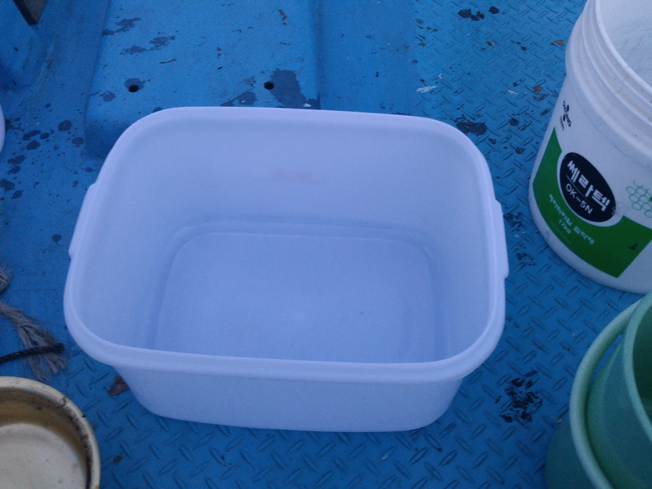드디어 시간이 되어 배 위에 올랐습니다. 오늘의 멤버는 다섯 명~ 선장님과 함께 한림 앞바다로 출발했습니다. 각자 잡은 한치를 잡아 올 통들을 들고 출발했어요. 오른쪽의 사진이 제 통이랍니다. 출발할 때는 아무것도 없는 깔끔한 통, 과연 이 곳에 얼마나 한치를 담을 수 있을까요?