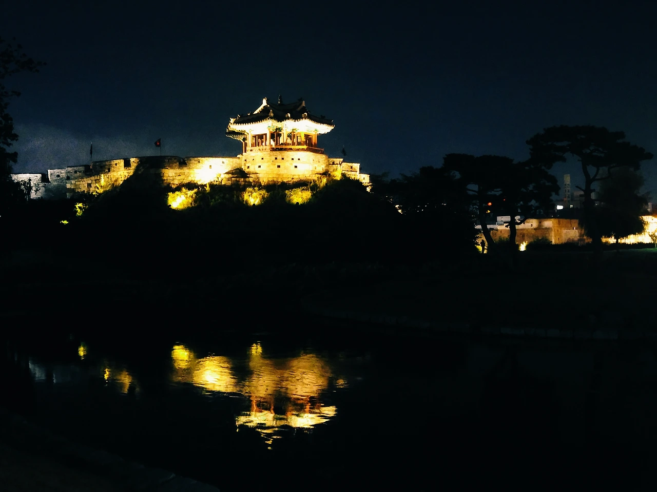 또한 야간에도 수원화성을 걸으며 감상할 수 있도록 은은한 조명도 잘 되어 있어 밤길을 산책하기에도 딱 좋은 환경이었습니다. 수원화성의 일부인 동북각루, 조명에 밝게 빛나는 모습이 방화류수정에 반영되는 모습은 뜨거운 축제 현장에서도 마음을 차분하게 만들어 주는 묘한 힘이 있었습니다.