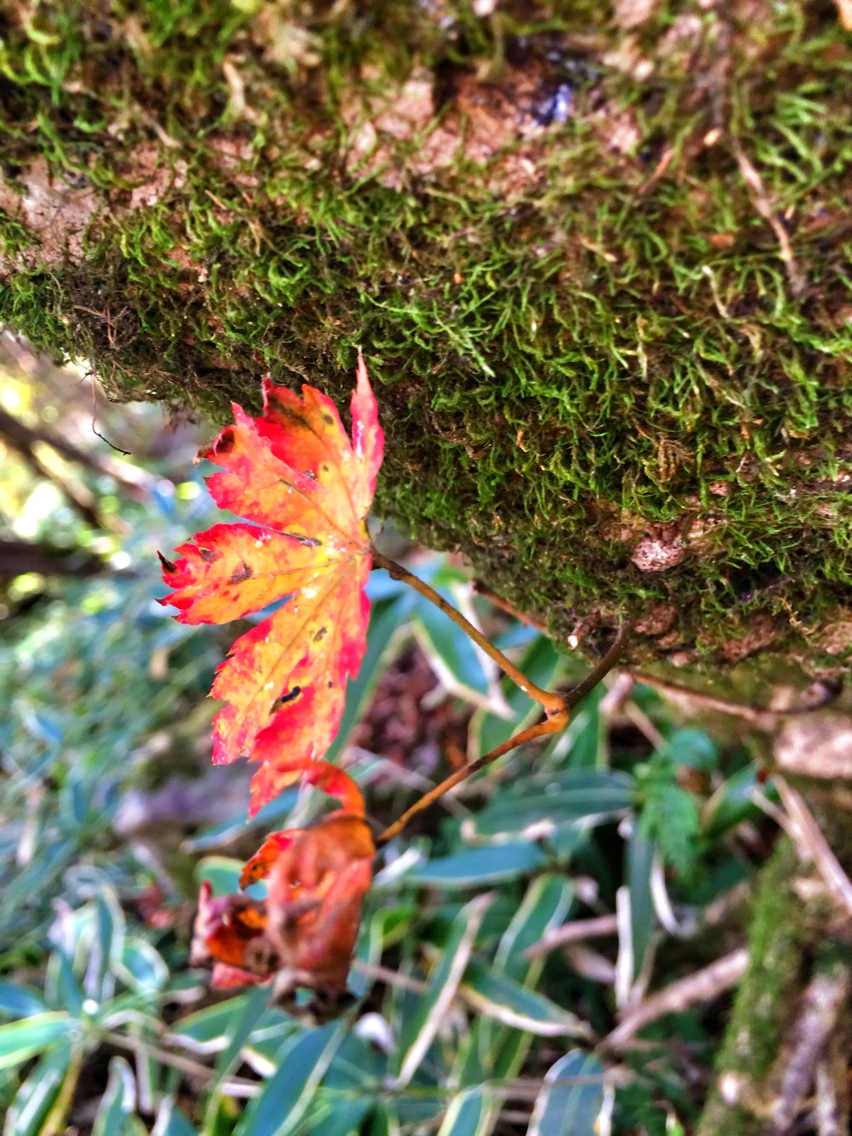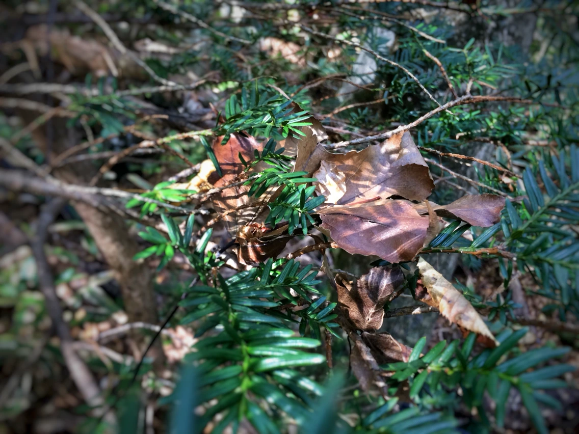 탐방로 곳곳에서 가을 풍경을 만날 수 있습니다. 사계절 내내 파란 주목나무 잎에 떨어진 낙엽, 나무 밑동 한편에 자그마하게 매달려 있는 붉은 단풍잎 등 구석구석 숨겨진 가을을 찾는 재미가 있습니다.