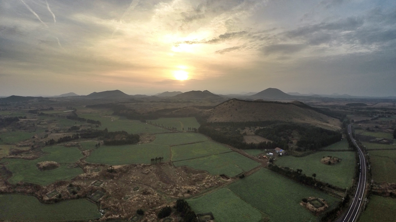 억새가 가득한 용눈이오름에서 드론으로 셀카도 찍어보고, 드론을 더 높이 올리니 또 다른 모습의 석양을 만날 수 있었습니다. 사방을 둘러 봉긋한 오름들이 보이고, 저 멀리 태양은 점점 붉게 물들어 가고 있는 모습은 실시간으로 전해지는 작은 모니터로 보아도 멋진 풍광이었습니다.
