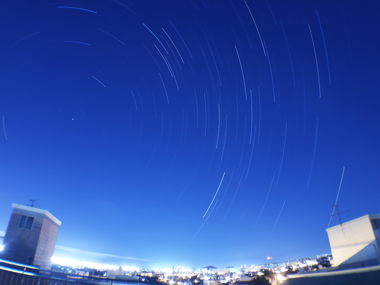 DSLR엔 설정만 해 놓으면 일정 시간 동안 자동으로 찍히지만 폰카에는 그런 기능이 없기에 정해진 시간마다 블루투스 셔터를 300번 가까이 눌러야 하는 과정을 겪어야 했습니다. 그렇게 찍은 몇백 장의 사진을 프로그램을 통해 연결해 다음과 같은 '별의 일주'사진을 완성할 수 있었습니다.