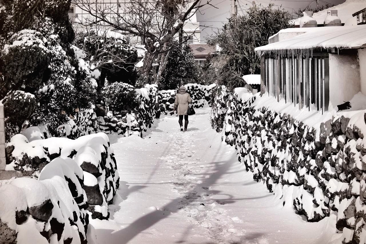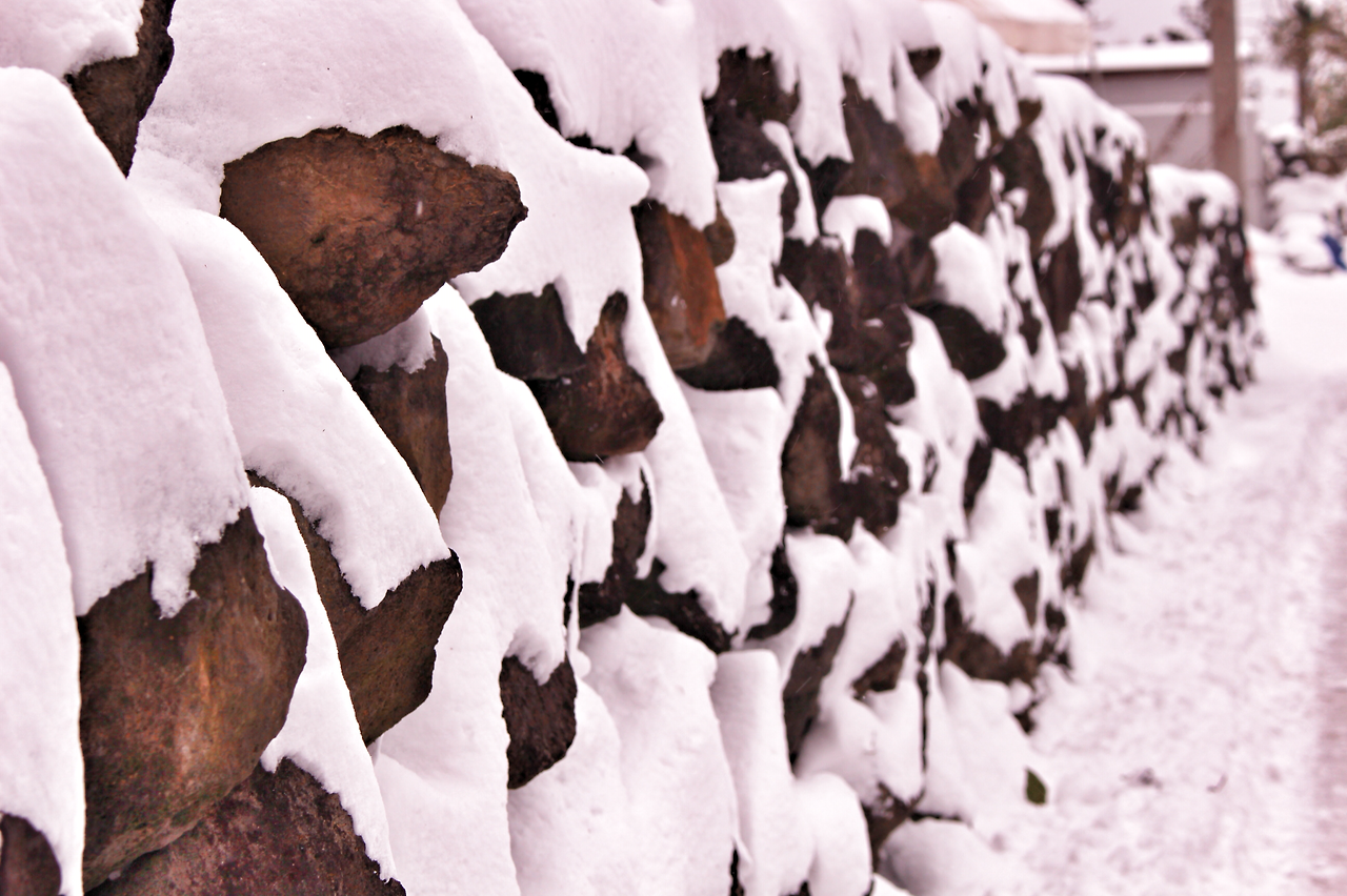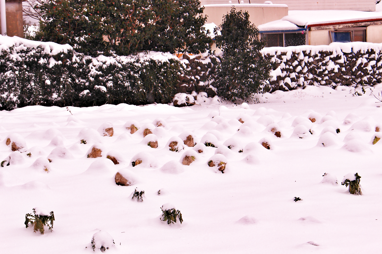 마을 돌담에도 눈이 쌓이고, 무와 배추가 자라고 있는 밭에도, 꽃망울을 준비하고 있는 동백꽃에도 눈이 쌓여 온 세상이 하얗게 변해버렸습니다. 처마에 매달려 있는 커다란 고드름은 제가 이 동네에 살면서 한 번도 보지 못한 크기를 가지고 있었습니다.