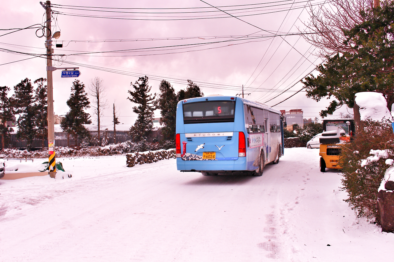 동네길도 꽁꽁 얼어붙어 차가 다니기 힘들지만 유일한 동네 교통수단인 공용버스는 오늘도 마을 주민을 태우고 길을 떠납니다. 하지만 꽁꽁 얼어붙은 버스정류장은 왠지 쓸쓸하게 보였습니다.