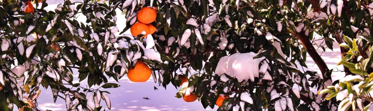 그나마 눈이 내리는 산간에 가까운 귤 농장에 가야 볼 수 있는 풍경을 동네에 있는 귤밭에서도 만날 수 있었습니다. 예전에 '눈 맞은 감귤'이 그렇게 맛있다는 얘기를 들은 적이 있어 양해를 구하고 하나를 따먹어 봤는데 그 맛을 표현하자면 '시원 달콤 새콤'이 딱입니다. 어쩌면 추운 겨울에 언 손을 녹여가며 까먹는 귤이라 더 맛있는 걸지도 모르겠네요!