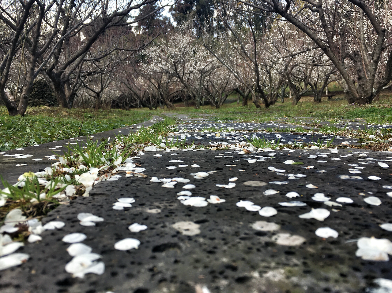 걸매생태공원의 매실나무는 비교적 큽니다. 그래서 그래서 나무 사이로 난 길을 따라 걸으며 매화의 향기에 취할 수 있는 곳입니다. 걸매생태공원을 찾기 며칠 전 비가 내려서인지 길가에는 이미 떨어진 매화꽃잎이 마치 눈처럼 쌓여 있었습니다.