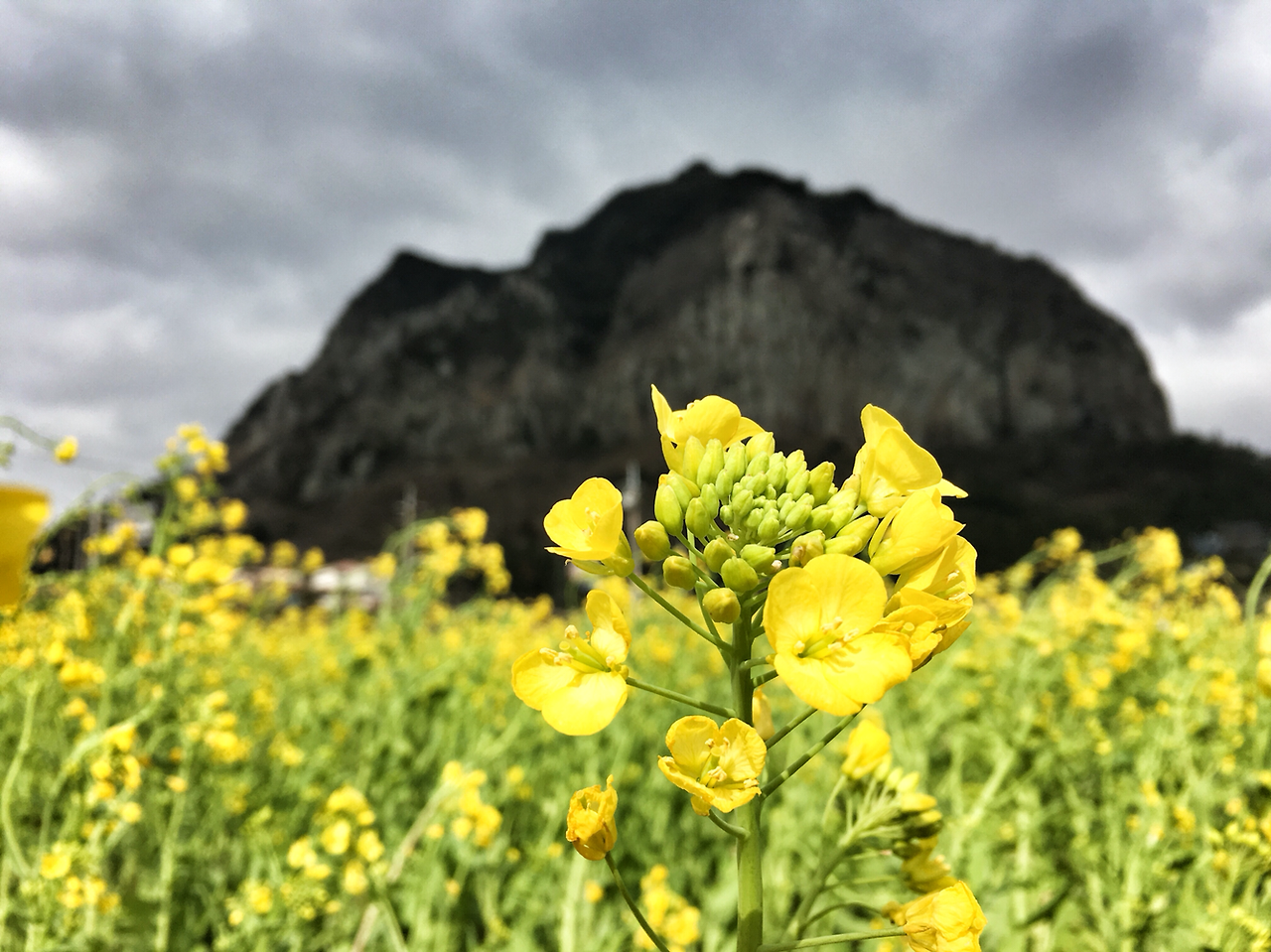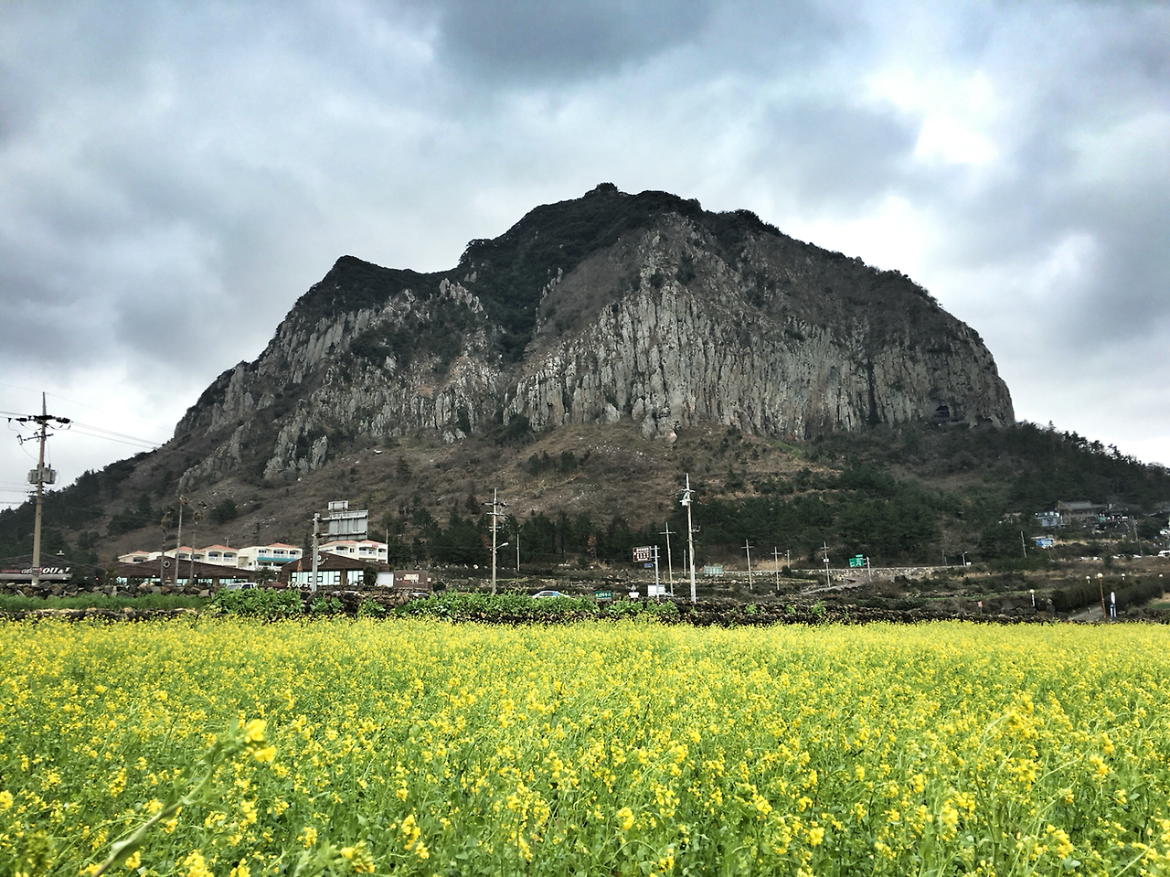 평소에는 웅장한 위용을 자랑하는 산방산이지만 노란 유채꽃밭의 배경이 되었을 땐 제주를 느낄 수 있는 듬직하고 아름다운 모습입니다. 갑자기 하늘에 먹구름이 가득해지고 바람이 거세지니 했지만 제주의 봄을 느끼기에는 충분히 아름다운 풍경이었습니다.