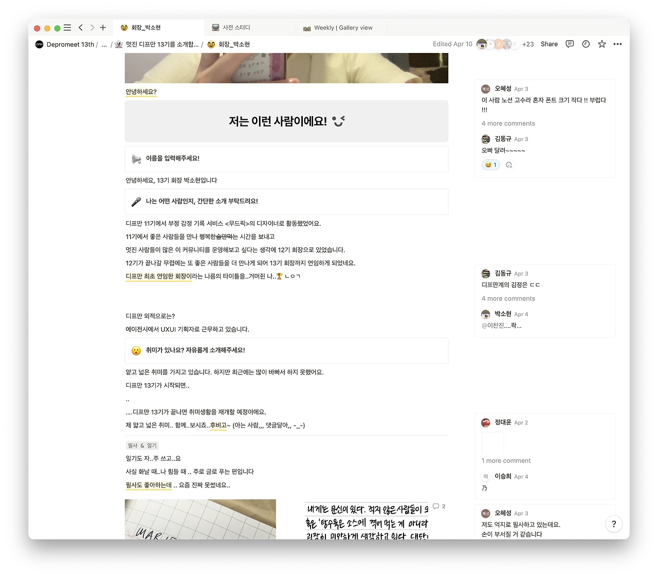 위 사진은 제가 디프만 13기 때 작성했었던 자기소개 페이지인데요. 이렇게 운영진과 멤버 모두가 자기소개를 작성하고, 서로 댓글을 달며 활발하게 소통할 수 있습니다.
