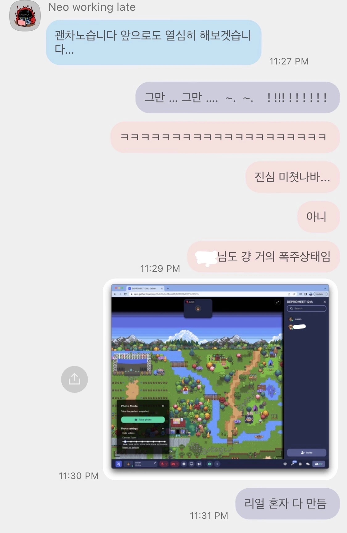 며칠 전 협업 제휴 관련 미팅을 위해 방문한 곳에서 관계자 분께 '디프만이라는 커뮤니티는 폐쇄적인 성격을 가지고 있는 것 같다'는 말을 들었다. 나 역시도 디프만 11기 멤버로 활동하면서 그런 점을 느끼긴 했지만, 디프만 바깥의 사람에게 그런 말을 들으니 많은 생각이 들었다. 팀원, 팀 간의 결속력을 위한 폐쇄성이라면 유지하는 것이 옳겠으나, 그렇지 않다면 커뮤니티의 성격을 조금 더 가져가는 것도 괜찮지 않을까? 개개인의 초상권, 정보 등을 침해할 수 있는 내용을 제외하고 디프만이 어떻게 굴러가는지 기록해두면 추후 13기, 14기... 디프만에 지원하고 싶은 분들과 디프만을 운영해보고 싶은 분들 모두에게 도움이 되지 않을까 싶은 생각이다.