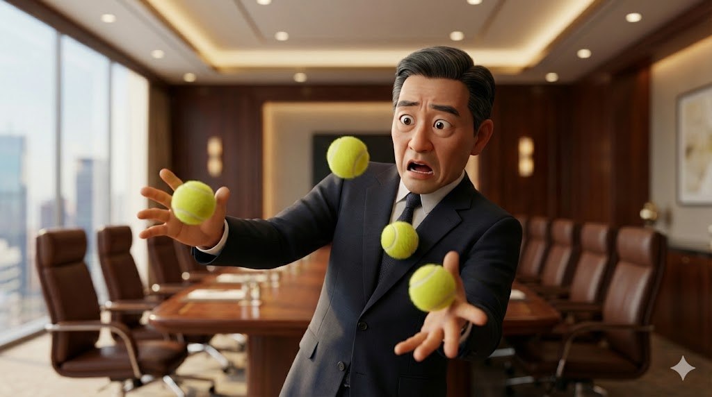 대표이사는 허우적대다가 단 하나의 공도 잡지 못했다. 공들은 사방으로 굴러갔고, 대표이사는 당황하며 물었다.