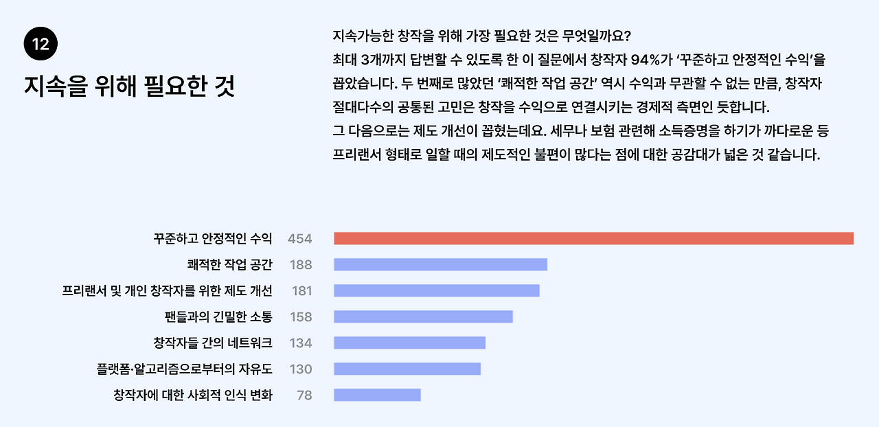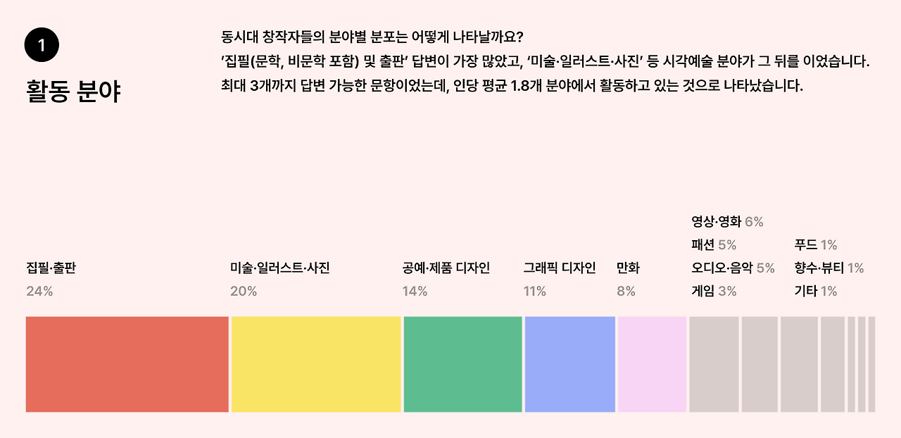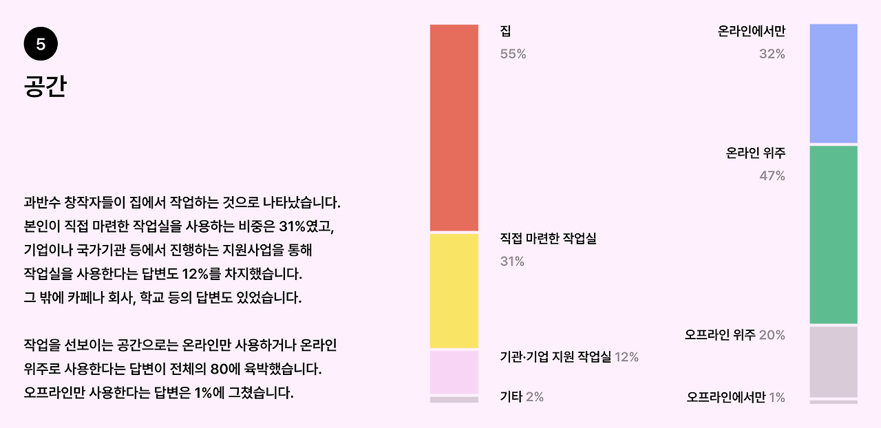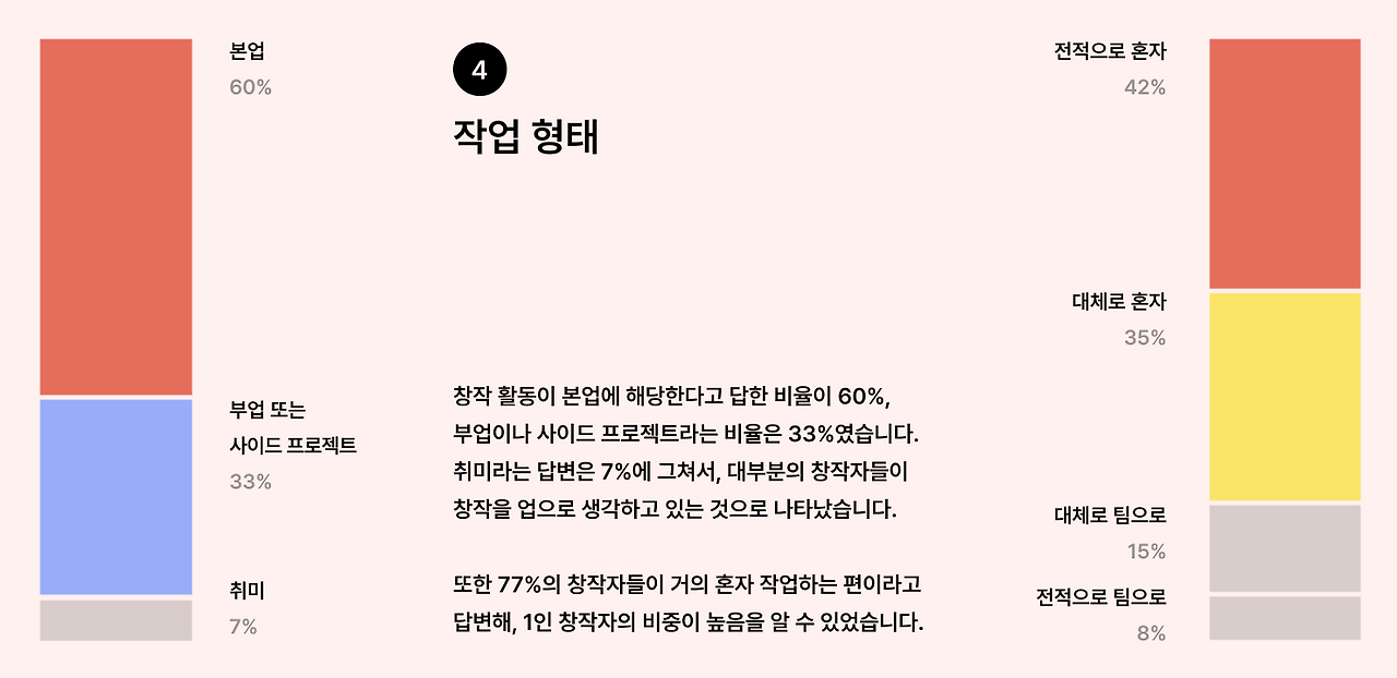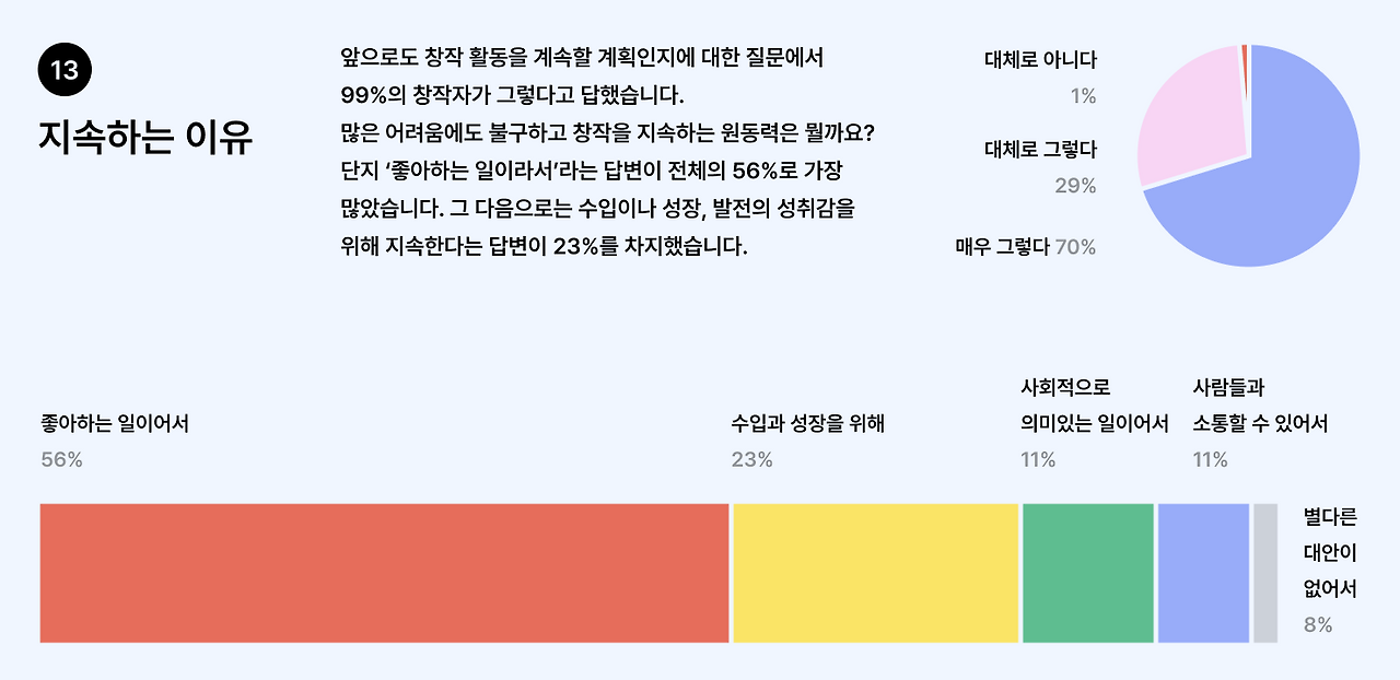 비록 77% 이상의 창작자들이 혼자 일한다고 답하셨지만, 이번 리포트로 조금이나마 서로가 연결되어 있음을 확인하는 계기가 되었으면 좋겠다는 생각을 해봅니다.