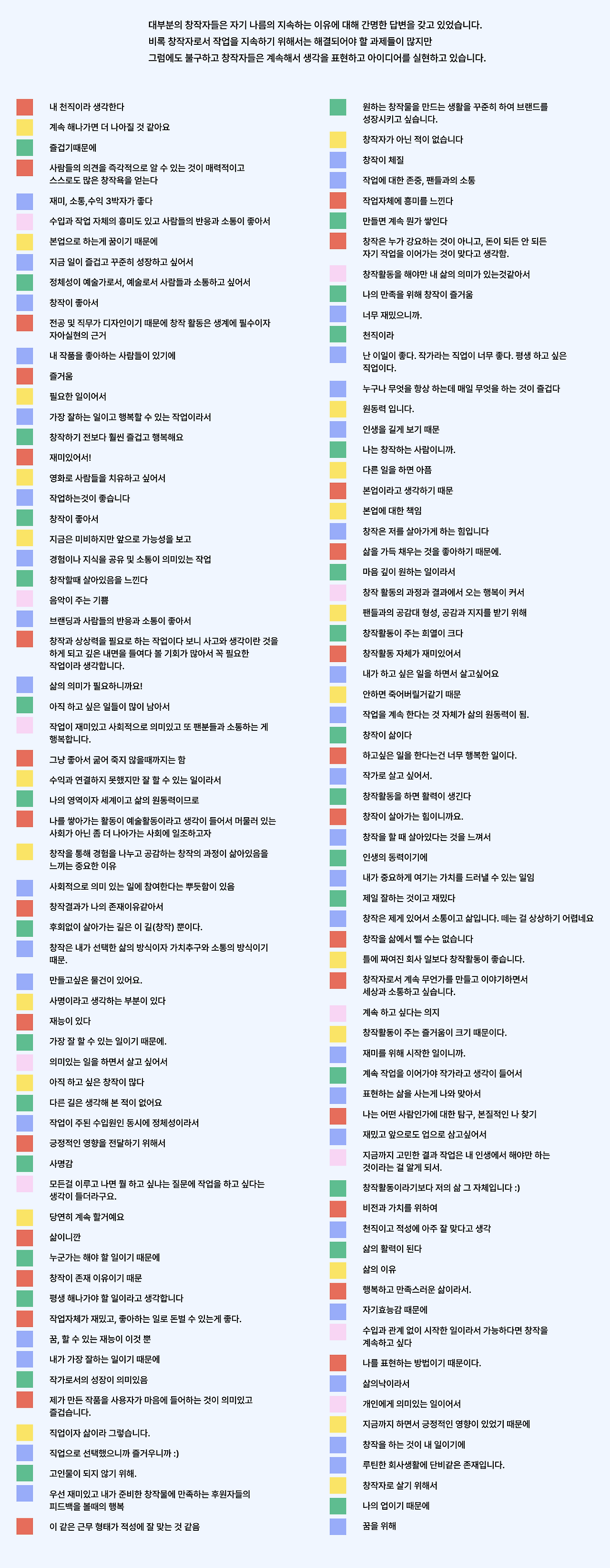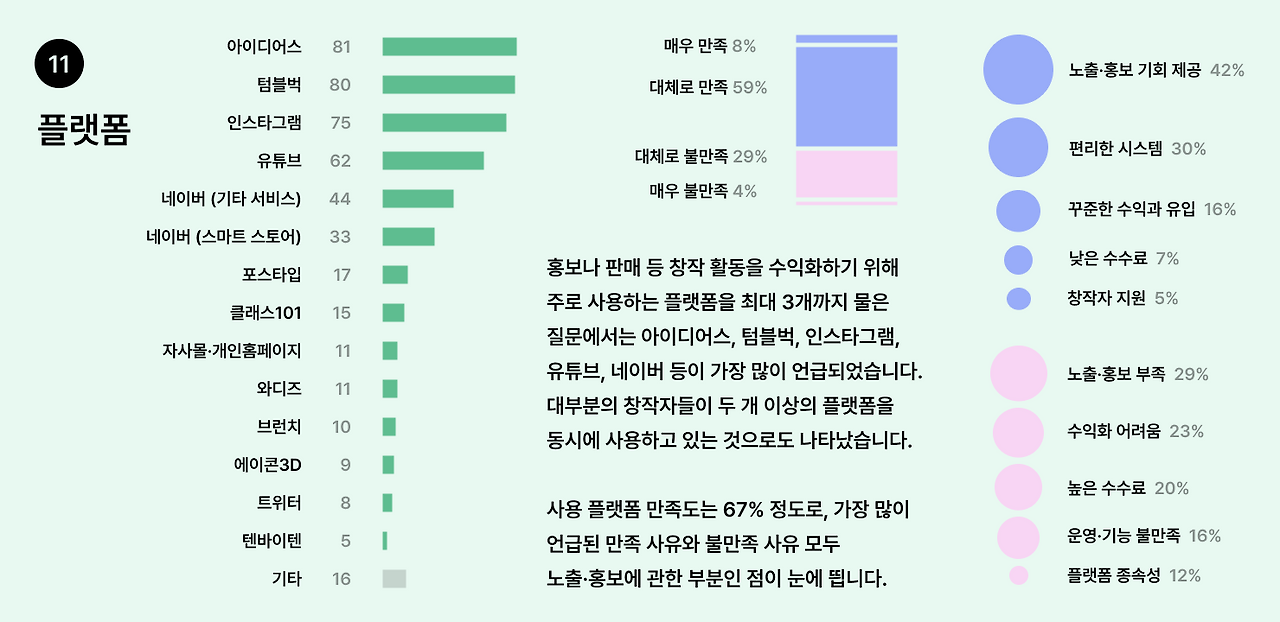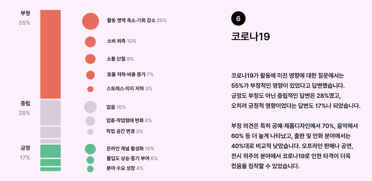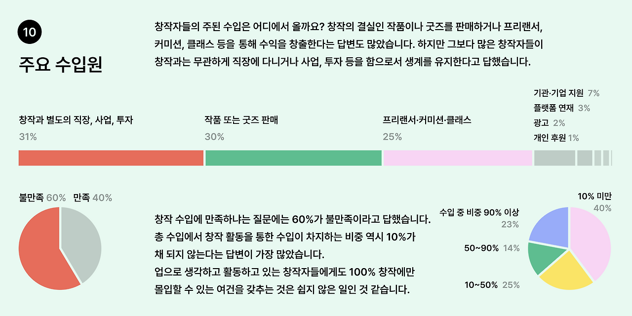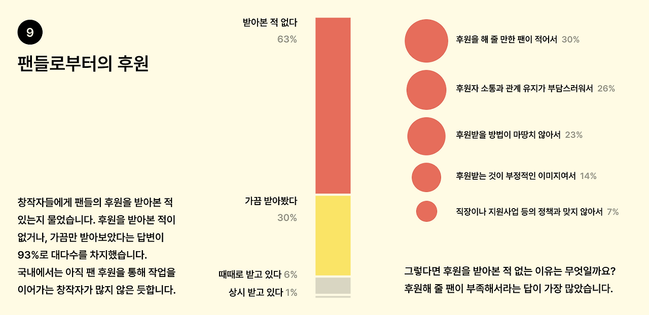 비록 77% 이상의 창작자들이 혼자 일한다고 답하셨지만, 이번 리포트로 조금이나마 서로가 연결되어 있음을 확인하는 계기가 되었으면 좋겠다는 생각을 해봅니다.