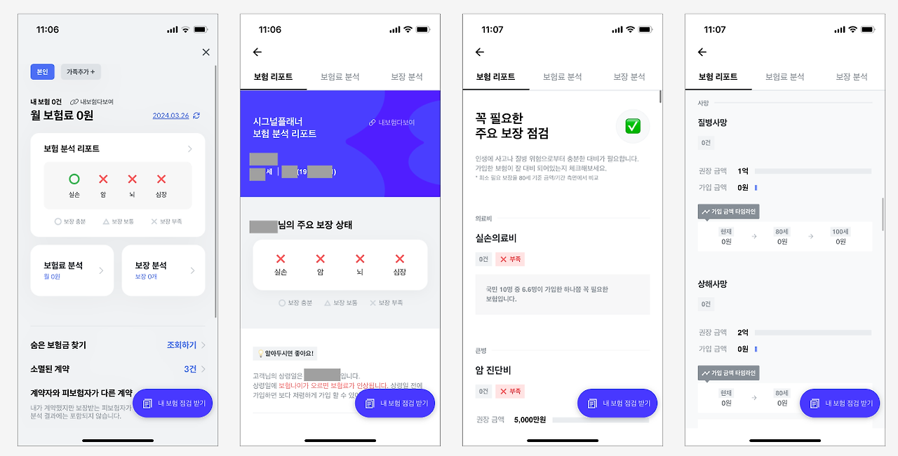보험 리포트는 다양한 포험별 보장 상태나 무엇이 부족한지 시각화하여 쉽게 보여준다.