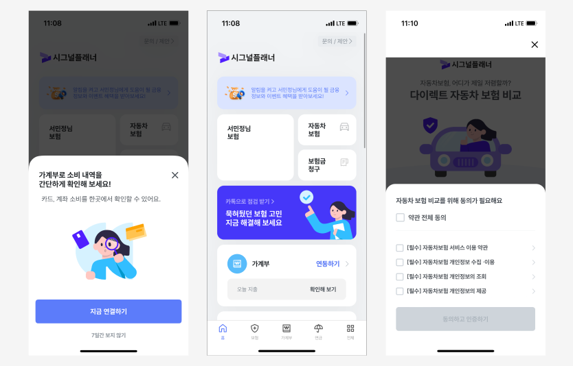 시그널플래너에서는 자동차 보험, 지출 연동하는 가계부 등 금융과 관련된 기능을 추가로 이용할 수 있다. 기사를 보니 순차적으로 영역별 기능을 확대하고 있는 것으로 보인다. 각 기능마다 또 별도의 연동 절차가 번거롭기는 하지만 한 번만 연동하면 다양한 나의 금융정보를 모아서 관리할 수 있어 편리하다.