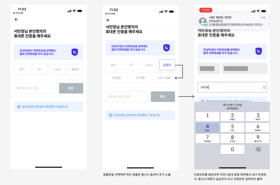 그리고 통신사를 선택하게 되는데 알뜰폰을 선택하면 알뜰폰 통신사가 하단에 추가 출력된다. 모든 통신사를 나열하지 않고 화면이 단순하게 보일 수 있도록 설계했다. 그리고 '확인' 버튼을 눌러 휴대폰 번호를 인증하면 동일 화면 내에서 통신사 버튼은 숨김처리 되고 인증번호 입력창이 출력되는 자연스러운 애니메이션이 적용되어 있다.