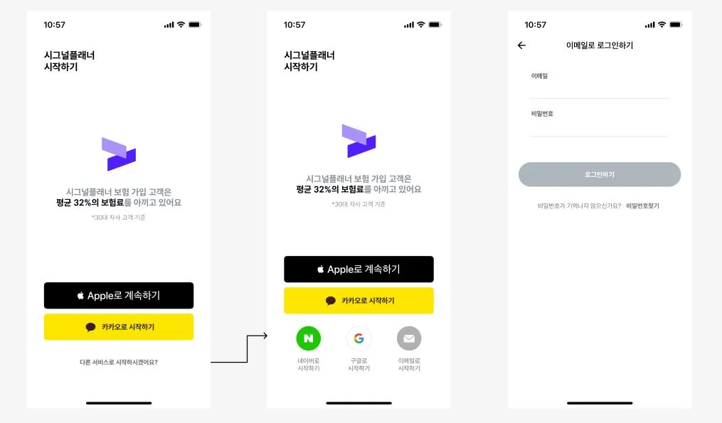 간편 로그인을 해도 추가 약관 동의 절차가 있기 때문에 일단 로그인 자체가 간편한 경로를 제시한 것이 아닐까 싶다. 네이버, 구글, 이메일은 계정 입력 절차가 있어 '다른 서비스로 시작하시겠어요?' 버튼을 눌러야만 노출되도록 숨겨두었다.