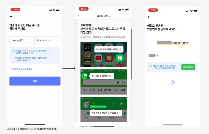 번호 인증을 마치면 이메일 인증 절차가 이어진다. 특이하게 느껴졌던 것은 '내 메일주소를 모르겠어요' 텍스트를 누르면 이메일 주소 확인 방법 가이드로 이동한다는 것이다. 보통은 유저가 본인의 메일 주소를 모를 거라는 가정을 하지는 않는데, 실제 이런 사용자 문의가 자주 접수됐던 것인지 궁금했다.