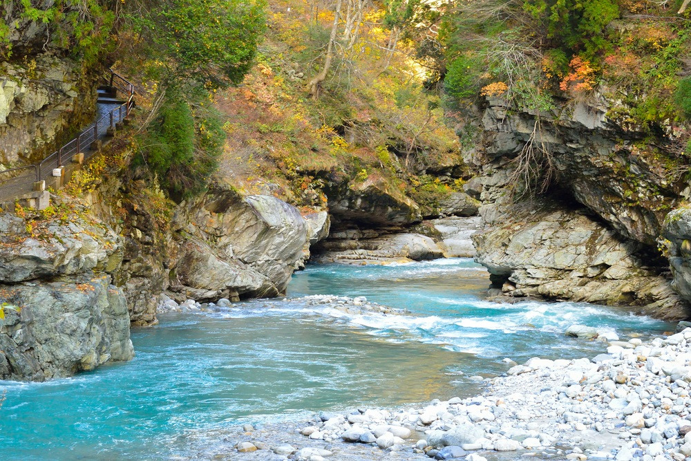 옛날에 구로베강 전원개발용의 재료를 운반했던 철도로 봄~가을은 일본을 대표하는 산악관광철도로 활약하고 있습니다. 창문이 없는 개방형 객실을 추천하는데요, 사람 많은 주말이라 투리스타에서 미리 좌석을 예약해드렸습니다. 종점역까지 약 1시간 20분. 일본에서 가장 깊은 V자 협곡을 가로지르듯이 달려가요~!