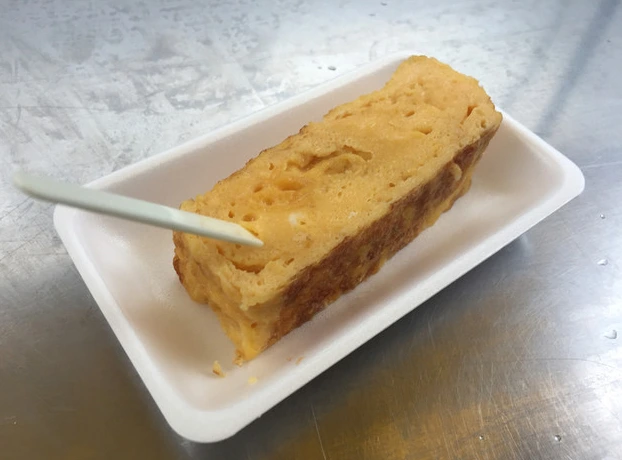 쓰키지시장의 또 하나의 명물은 달달한 달걀말이(다마고야키/100엔)입니다. 달걀말이집은 시장 내에 몇군데가 있는데 백종원이 다녀온 집은 [마**케]입니다. 80년이상의 역사를 가진 달걀말이 전문점이죠. 일본인들은 이 달달한 달걀말이를 정말 좋아합니다. 얼마나 달달한지 맛보세요!