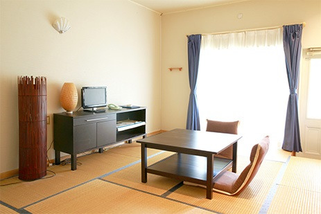객실은 혼자 드러눕기도 좋은 다다미방. 혼자 대자로 누워 있어도 정말 편안한 객실이죠. 객실뿐만이 아니라, 이 숙소는 영화 <안경>을 촬영한 곳이기도 합니다. 석양이 아름답게 보이는 가든테라스, 밤에 하늘을 올려다보는 잔디광장, 간판견인 강아지가 2마리 있어요.