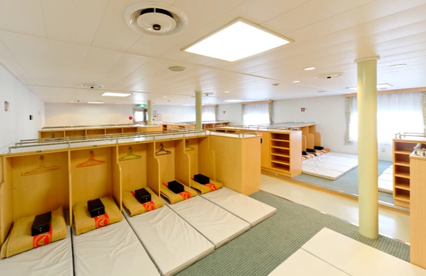 이제 요론섬을 떠납니다. 돌아가는 교통편은 비용절약을 위해 페리를 선택했죠. 요론항에서 오키나와 나하항까지는 약 4시간 50분이 소요됩니다. 좌석은 따로 없고, 객실 스타일이에요. 사물함이 딸린 2등 화실 객실에서는 누워갈 수 있어서 편해요~ 페리 예약은 출발 전에 투리스타에서 도와드립니다.