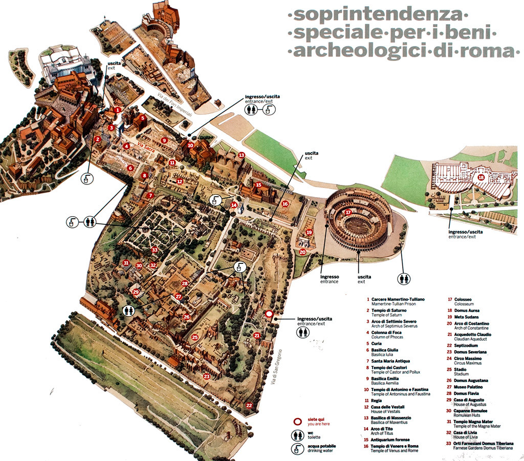 콜로세움을 다 보셨다면 이제 건너편에 위치한 포로 로마노로 이동합니다. 이곳에 위치한 팔라티노 언덕은 로마의 7개 언덕 중 가장 중앙에 자리 잡고 있으며 도시에서 가장 오래된 지역 중 하나입니다. 이곳은 이탈리아 수도의 발상지로 간주되며 상류층을 중심으로 기원전 1000년부터 거주한 것으로 추정됩니다. 로마 제국의 초대 황제인 아우구스투스의 궁전터가 남아 있는 것으로 유명합니다.
