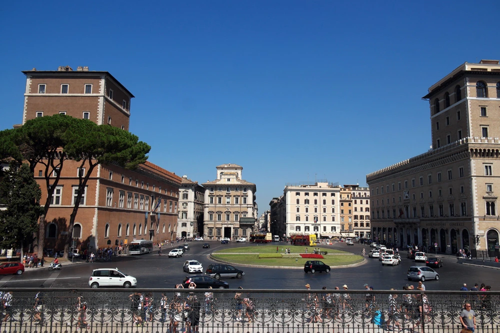 이탈리아 통일 전 베네치아 공화국의 대사관이 있던 자리에 만들어진 광장입니다. 이탈리아가 통일 된 해인 1871년 통일을 기념하기 위해 조성되었으며 이탈리아를 통일한 비토리오 에마누엘레 2세 기념관이 있습니다. 기념관 사진이 가장 잘 나오는 곳도 베네치아 광장입니다. 베네치아 광장의 옛 대사관 건물은 독재자 무솔리니가 2차 세계대전의 참전을 선포했던 장소이기도 합니다.