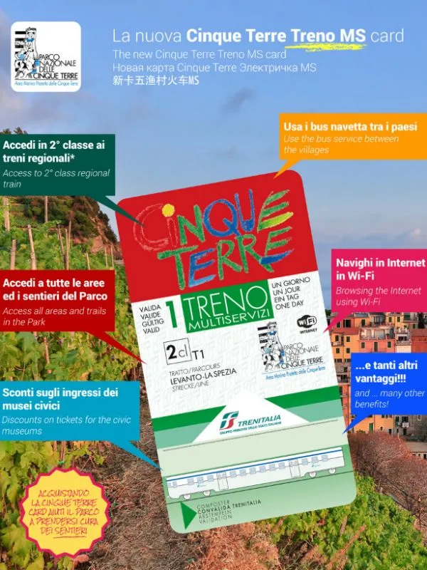 친꿰테레 여행자라면 유용한 패스입니다. 이 패스는 라스페지아와 레반토 사이를 오가는 기차를 무제한 이용할 수 있으며 다양한 박물관과 산책로 등의 입장도 가능합니다. 판매는 라 스페치아 역 또는 친꿰테레 관광안내소에서 판매합니다.