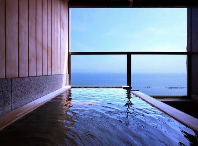 객실에서도 바다를 전망하면서 노천탕을 이용할 수 있지만, 료칸 내 남녀별 대욕장도 이용할 수 있습니다. 커다란 창문에서 바다를 크게 전망할 수 있어 내부에 있으면서도 개방감은 최고! 밤에는 오징어잡이 어선의 불빛도 보입니다. 정원을 즐길 수 있는 노천탕도 이용할 수 있습니다.