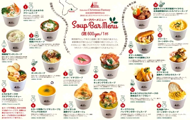 '하코다테 크리스마스 판타지' 기간 중에는 별돌창고 옆에 스프 바가 생깁니다. 10군데 늘어선 스프 매장 중에서 먹고 싶은 스프를 맛보고 즐기세요. 콩콩 얼어붙은 공기 속에서 차가워진 몸을 따뜻하게 해주는 하코다테 마이 담겨진 스프를 다양하게 맛보세요. 16:30부터 20:00까지만 이용할 수 있어요.