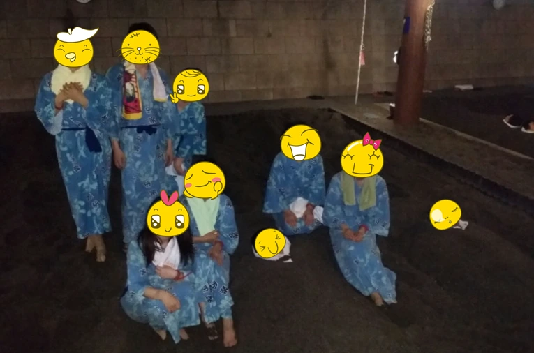 이 민박집에 매력이 또 하나. 민박집 바로 앞에 바다와 이브스키 명물 모래찜질온천 시설이 있다는 것! 짐을 풀고 편한 옷에 갈아입고 모래찜질을 체험하러 출발~! 유카타를 입고 모래사장 해변에 파묻히는 모래찜질은 모두가 처음하는 경험이었죠. 오래 허리통증을 앓았던 회원이 신기하게도 모래찜질 후, 허리통증이 사라졌다고 기뻐했었죠.