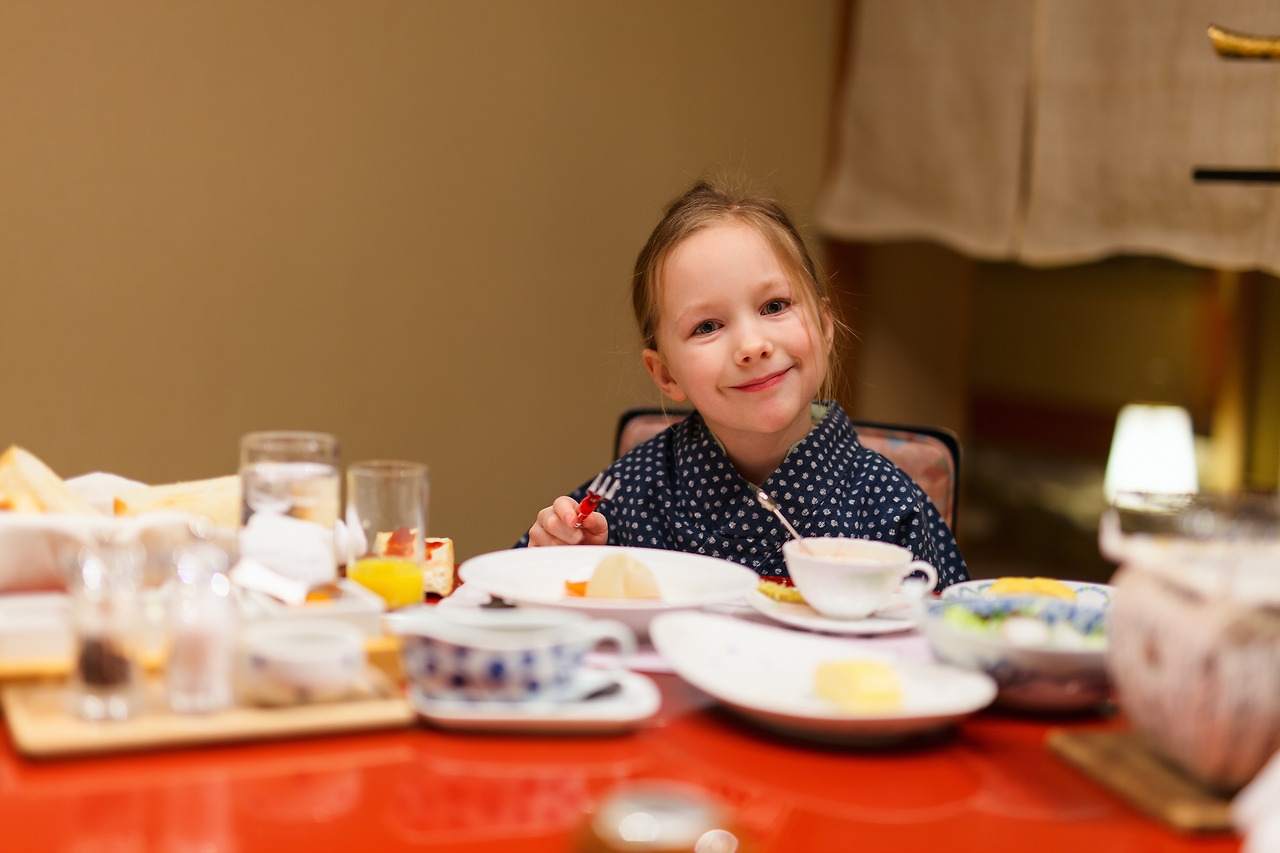 료칸에서 식사는 가이세키요리가 나온다고 말씀드렸는데, 아이들에게는 내용도 많고 회 같은 생소한 음식은 못 먹어 성인과는 다른 요리가 나오게 됩니다. 초등학생은 성인과 비슷한 가이세키요리 코스인데 가지수나 요리내용을 바꾸어 나오는 경우가 많습니다. 미취학아동용 식사는 어린이들 좋아할만한 것으로 구성된 어린이용식사(お子様ランチ)가 제공됩니다. 무료로 투숙할 수 있는 유아는 기본적으로 별도 제공되는 식사가 없으며, 식사가 필요할 경우에는 미취학아동용 식사를 추가하는 것으로 예약해야 합니다.