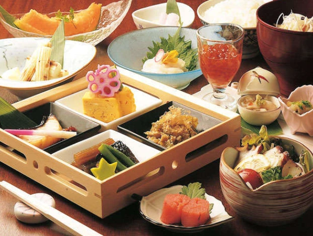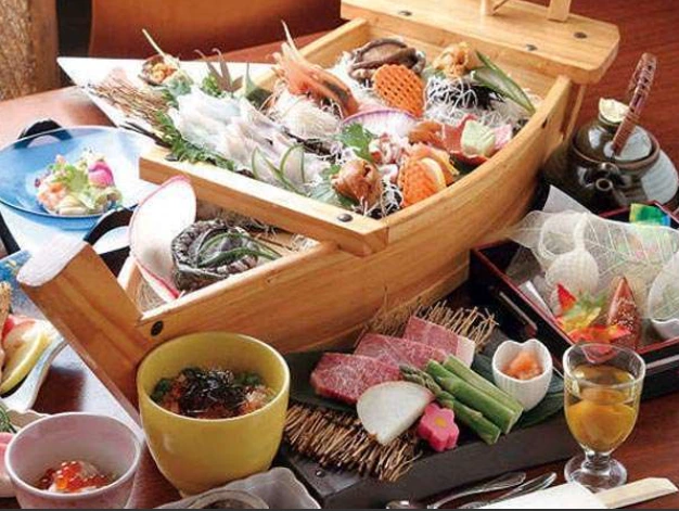 식사처 개인룸에서 먹는 석식은 북해도의 신선한 해산물을 중심으로 사용한 푸짐한 가이세키요리입니다. 눈에 보기도 화려한 가이세키요리로 즐거운 저녁시간을 보내세요.