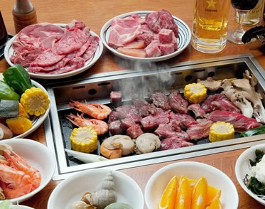 온천 후에는 호텔 앞에 병설된 바베큐 레스토랑에서 야키니쿠를 즐겨요! 북해도라고 하면 생각나는 진기스칸(양고기)을 비롯해 소고기갈비, 해산물, 야채, 식사, 디저트 등 다양한 메뉴를 뷔페 형식으로 즐길 수 있습니다.