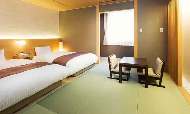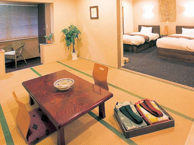 객실의 대부분은 화양실 구조입니다. 다다미와 침대를 같이 사용할 수 있는 방에서 느긋하게 휴식을 취하세요. 객실에서 천연온천을 즐길 수 있는 특별실도 있습니다.