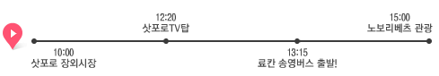 호텔에서 짐을 챙기고 오도리공원에 위치하고 있는 삿포로TV탑으로 이동해요. 미리 료칸측에 예약을 해놔서 이곳에서 출발하는 료칸 무료송영을 이용할 수 있어요. 출발 30분전까지 접수를 마치고, 남은 시간의 TV탑 내를 구경하세요! 노보리베츠까지는 약 1시간 45분! 대중교통 이용 안하고 편하~게 이동해요.