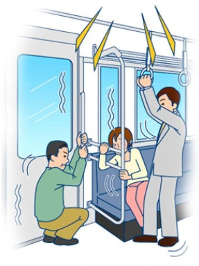 강진을 감지하면 전철은 긴급정차되게 되어 있습니다. 좌석에 앉아 있을 경우에는 낮은 자세를 취하고 머리를 가방 등으로 보호하고, 서 있는 경우에는 손잡이를 꽉 잡고 넘어지지 않도록 합니다. 신칸센은 "조기지진검지경계시스템"이 작동하여 긴급정차합니다. 신칸센은 고속주행하고 있는 경우가 많기 때문에 좌석에 앉아 있을 경우, 앞으로 몸이 날아가지 않도록 좌석 사이에 몸을 숨기고, 서있는 경우에는 손잡이를 잡아 넘어지지 않도록 합니다. 정차 후에는 승무원 지시에 따라주세요.