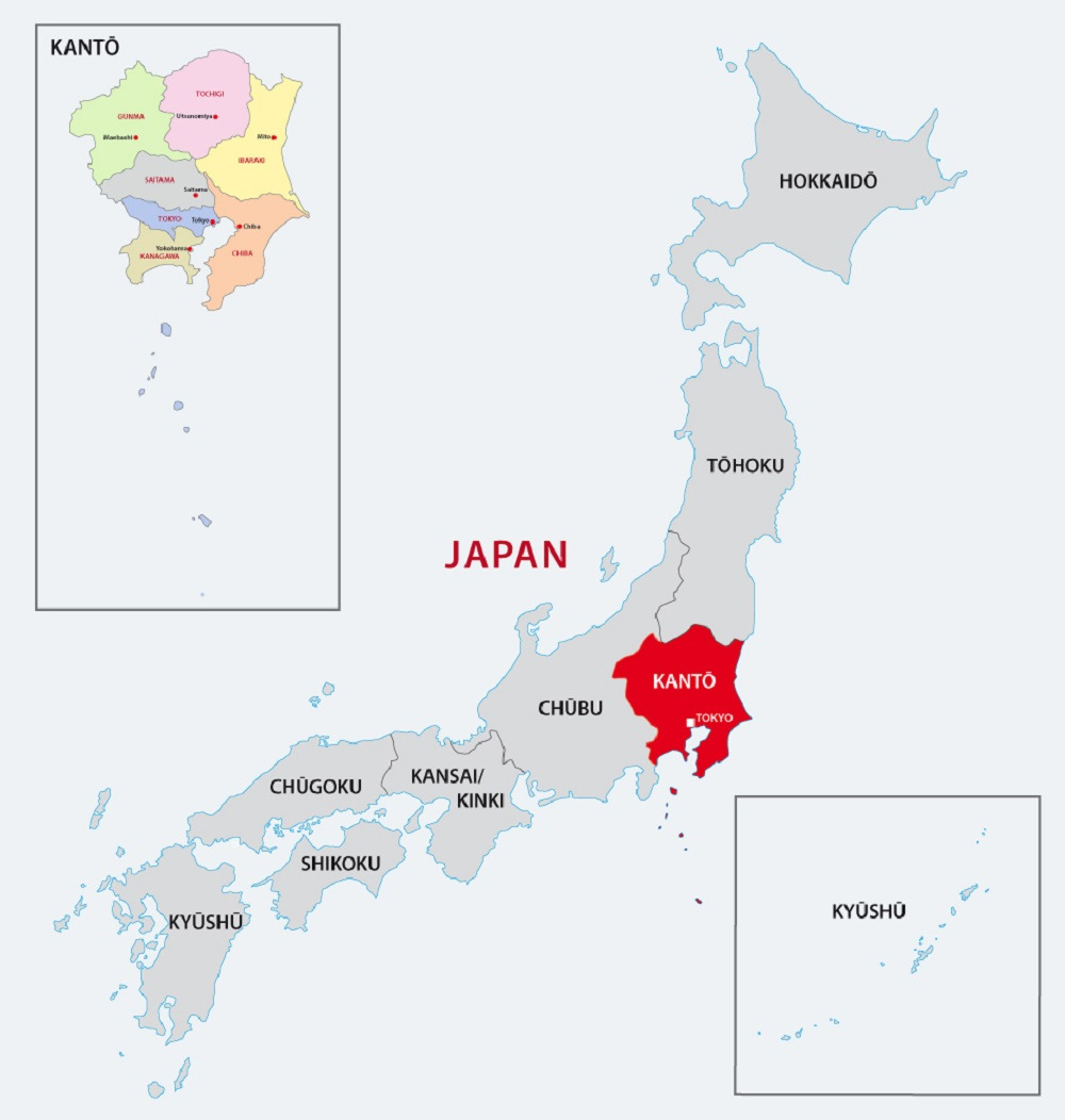일본에는 47곳의 지역이 존재합니다. 47곳 도도부현(都道府県)이라고 표현하는데요, 1곳의 도(都)는 도쿄, 1곳의 도(道)는 북해도, 2곳의 부(府)는 오사카와 교토, 나머지 43곳의 현(県)이 있습니다. 예를 들어, 후쿠오카는 정확하게 후쿠오카현이라고 표현하죠. 한국에 경상도, 전라도가 있는 것처럼 47곳의 지역을 크게 나누면 왼쪽 그림처럼 나눌 수 있어요. 북해도 지방, 아키타가 속한 도호쿠 지방, 수도 도쿄가 속한 칸토 지방, 나고야가 속한 추부 지방, 오사카가 속한 간사이 지방(킨키 지방이라 하기도 합니다), 히로시마가 속한 추고쿠 지방, 4개 섬 중에서 가장 작은 시코쿠 지방, 한국사람에게도 잘 알려진 큐슈 지방으로 나눠집니다.
