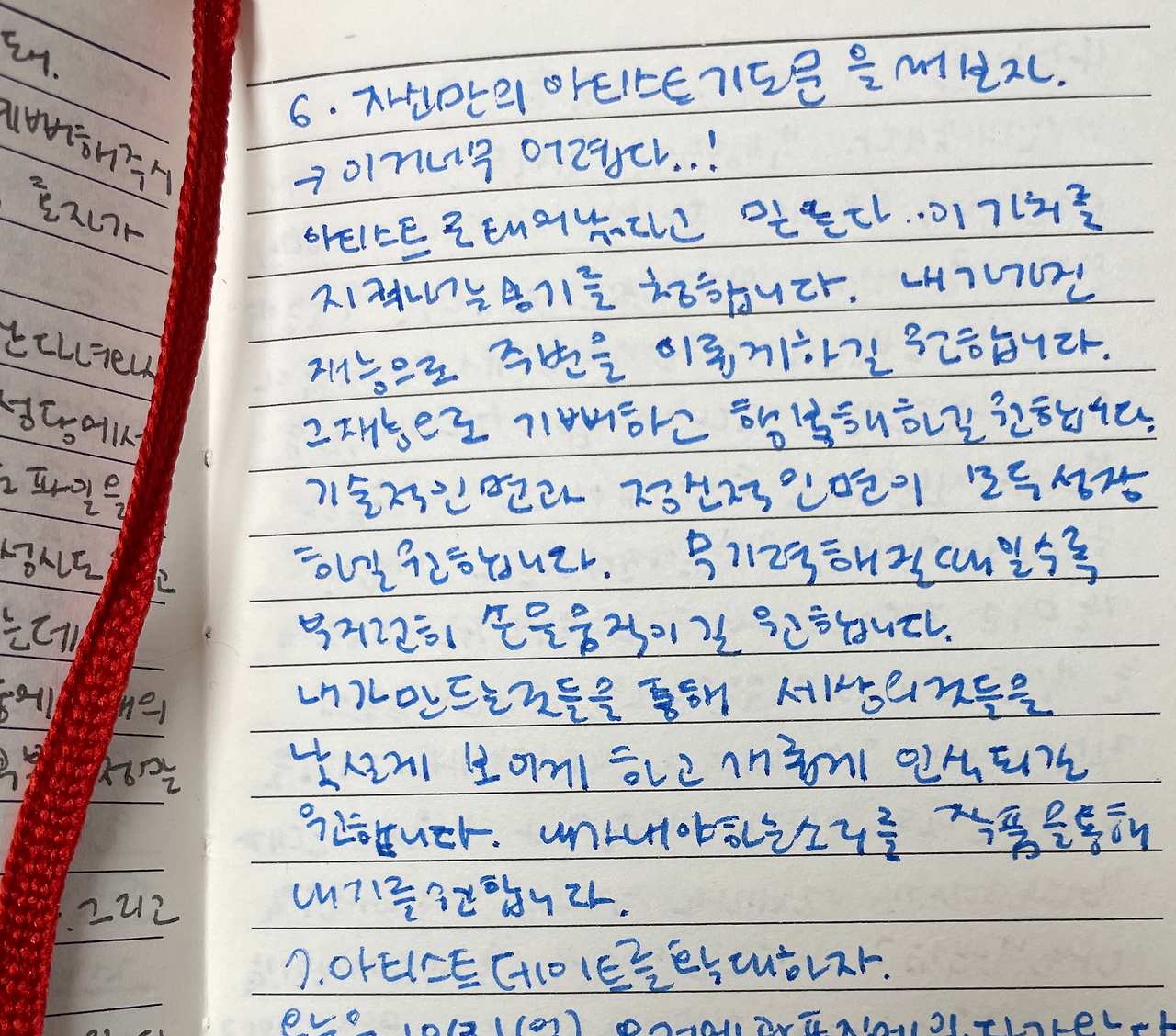 아티스트로 태어났다고 믿는다. 이 가치를 지켜나갈 용기를 청합니다. 내가 가진 재능으로 주변을 이롭게 하길 원합니다. 그 재능으로 기뻐하고 행복해하길 원합니다. 기술적인 면과 정신적인 면이 모두 성장하길 원합니다. 무기력해질 때일수록 부지런히 손을 움직이길 원합니다. 내가 만드는 것들을 통해 세상의 것들을 낯설어 보이게 하고 새롭게 인식되길 원합니다. 내가 내야 하는 소리를 작품을 통해 내기를 원합니다.