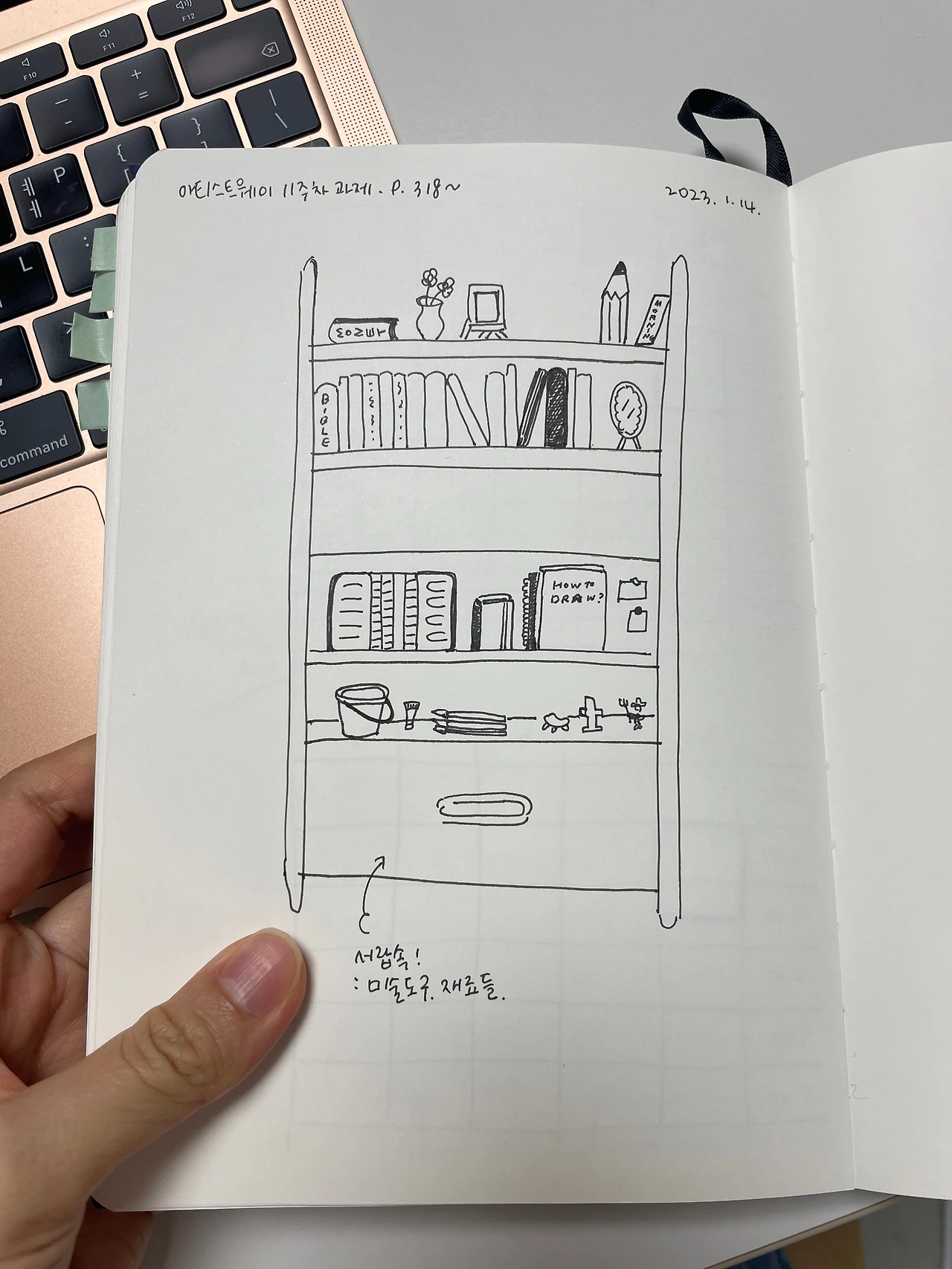 - 혼자만의 감성적인 시간(책에서 얘기하는 아티스트데이트)을 더 적극적으로 활용한 것이 가장 큰 변화라고 생각한다. 온전히 나의 정서를 위한 충전의 시간에 대해 나는 가질 자격이 없다고 생각했던 죄책감이 사라진 것이 큰 변화이다. 종종 아티스트데이트를 하러 내가 좋아하는 장소로 나가곤 한다. 기분전환도 되고 나가서 드로잉이나 독서를 하면 집에서와는 다른 또 다른 느낌으로 집중하게 되는데 그런 기분들을 즐길 수 있게 되었다. 이런 변화처럼 그림을 그리려 할 때 드는 비슷한 죄책감과 비난의 목소리도 완전히 사라지기를 소망한다.