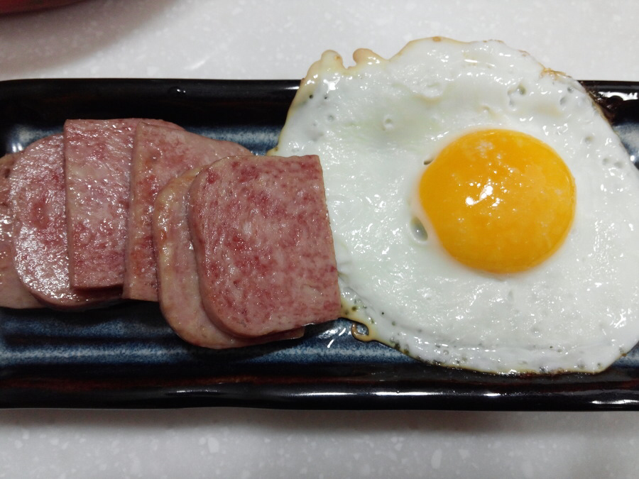 아침 늦게 일어나 스팸을 굽고,