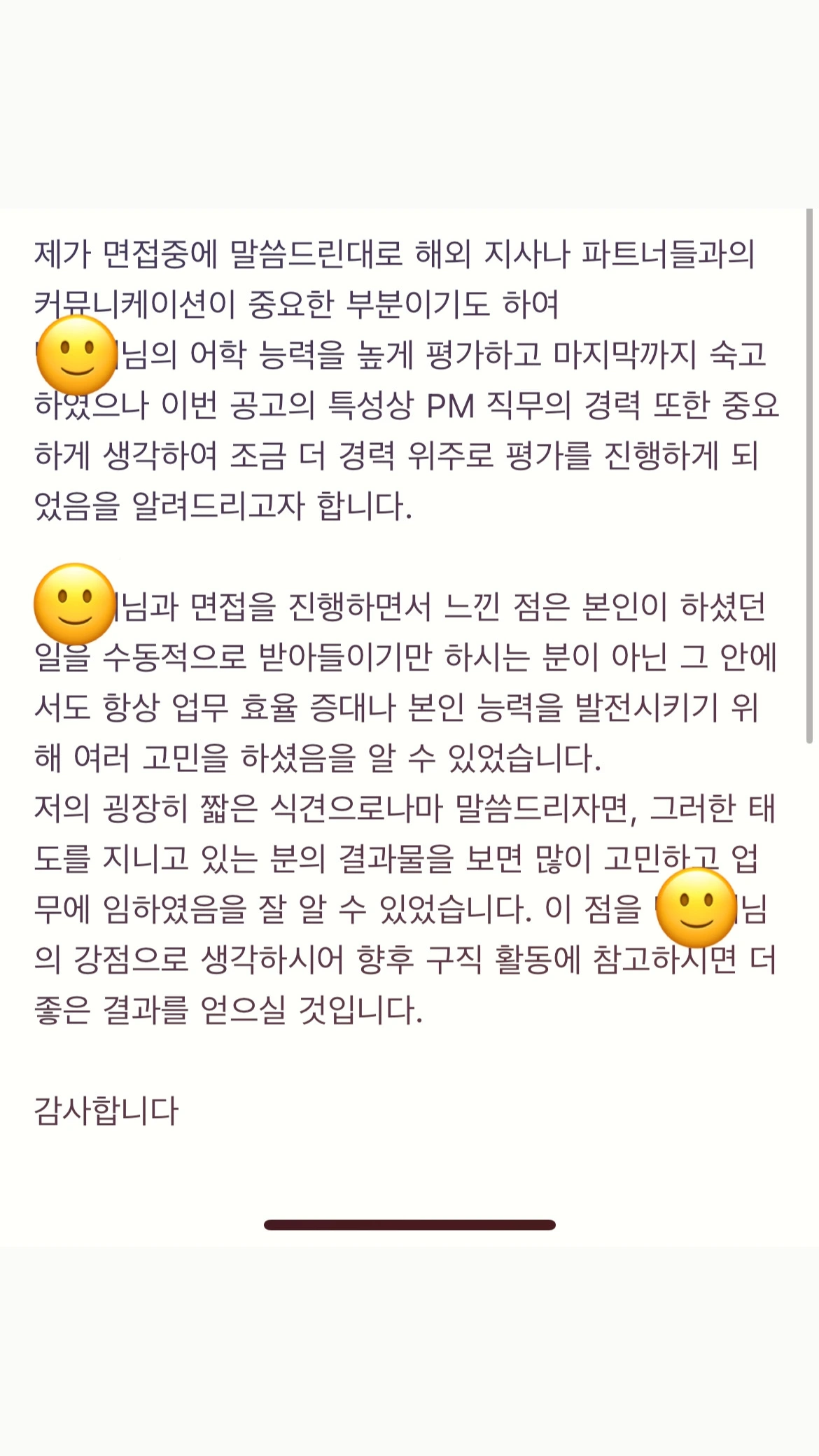 *하지만 결과는 탈락... 너무 아쉬워서 hr 매니저에게 메일로 혹시 어떤 부분 때문에 탈락했는지 피드백 주실 수 있냐고 보냈는데, 면접관분께서 직접 장문의 메일을 보내주셨다. 회사 이미지 관리 차원이 아닌, 나를 기억하고 정성스레 쓴 피드백에 정말 감사했다. 그들도 나를 놓쳤지만 나도 그들을 놓친 게 너무 아쉬워..(